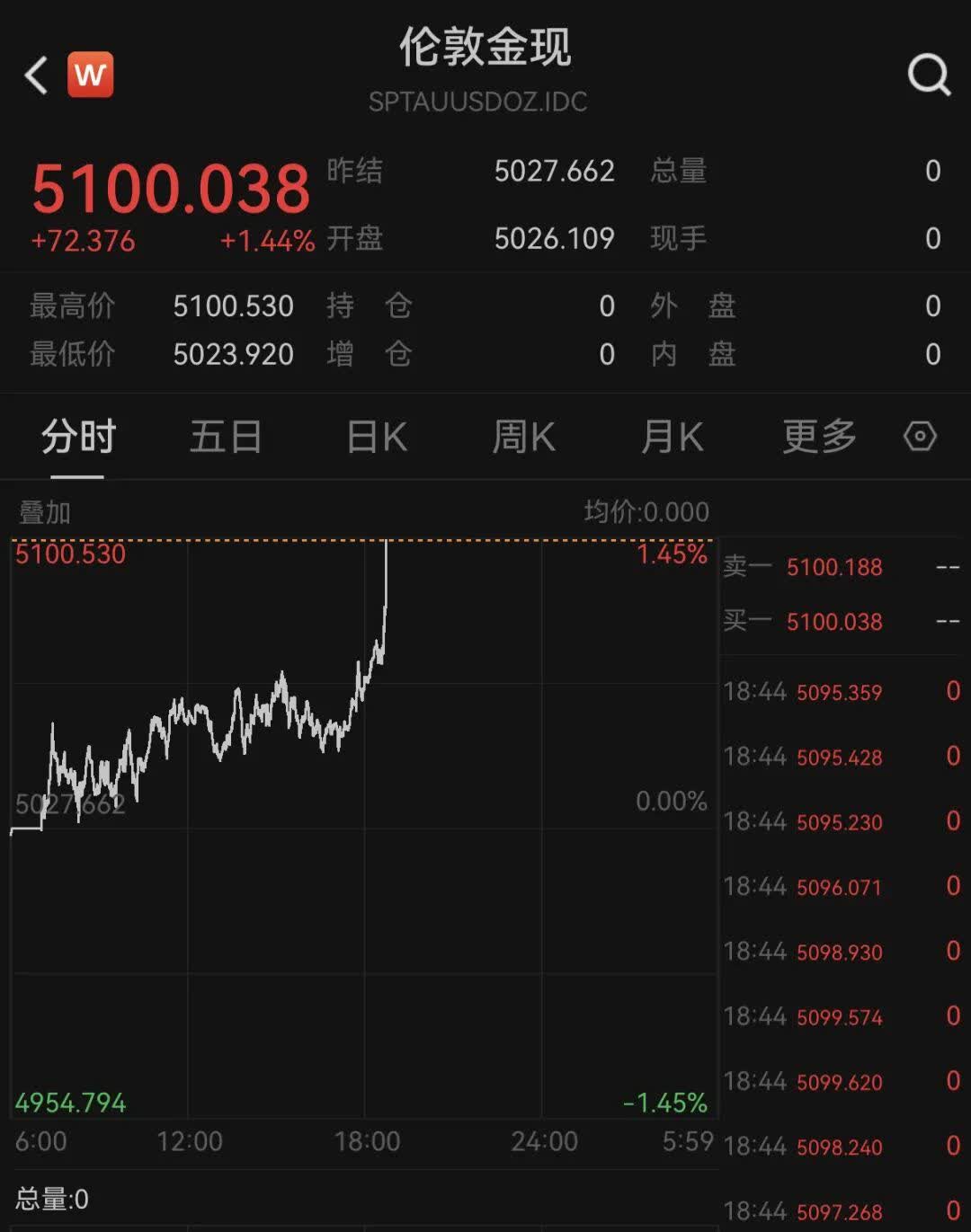 11日,現貨黃金持續拉漲,盤中再次突破5100美元大關,漲超1.4%。