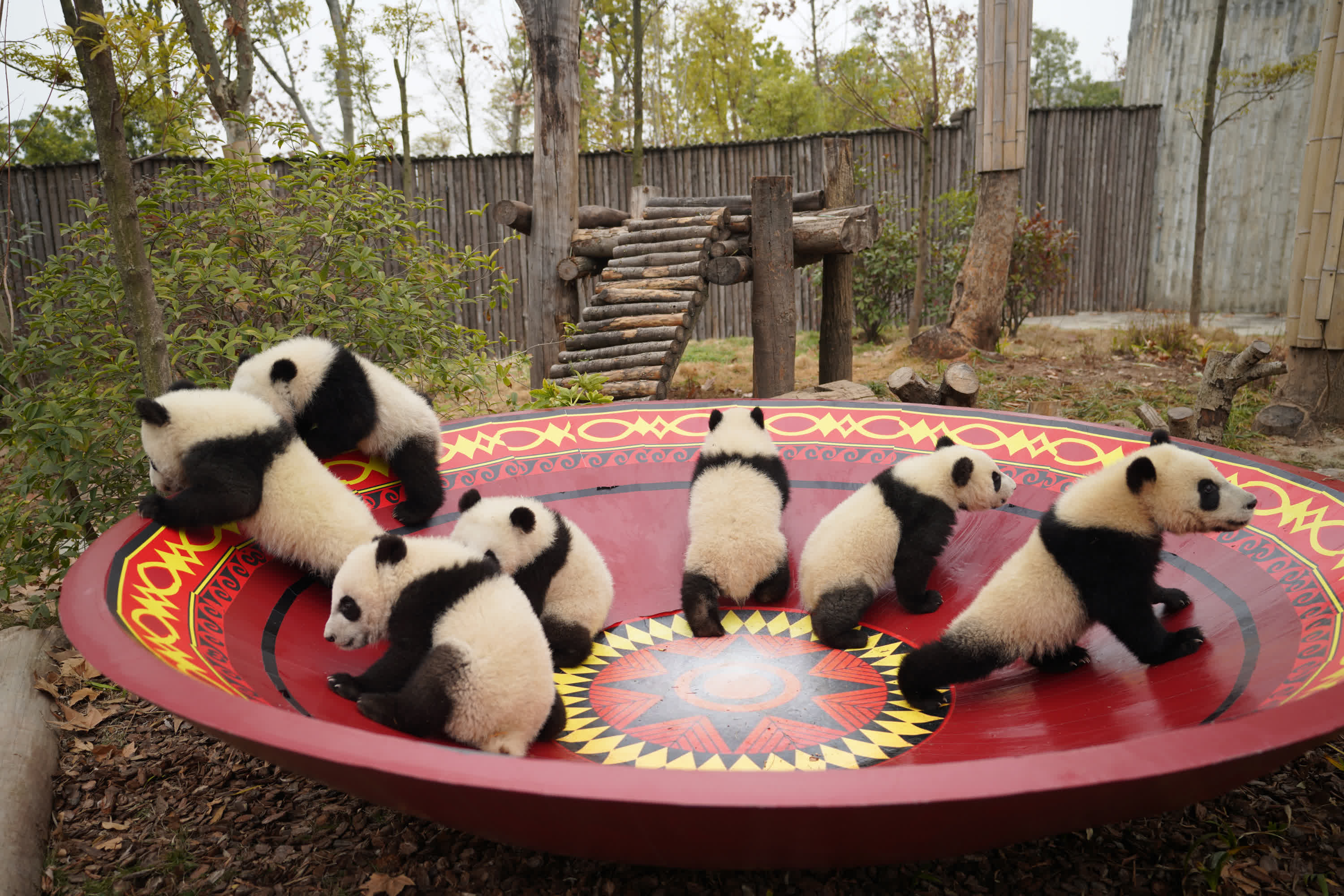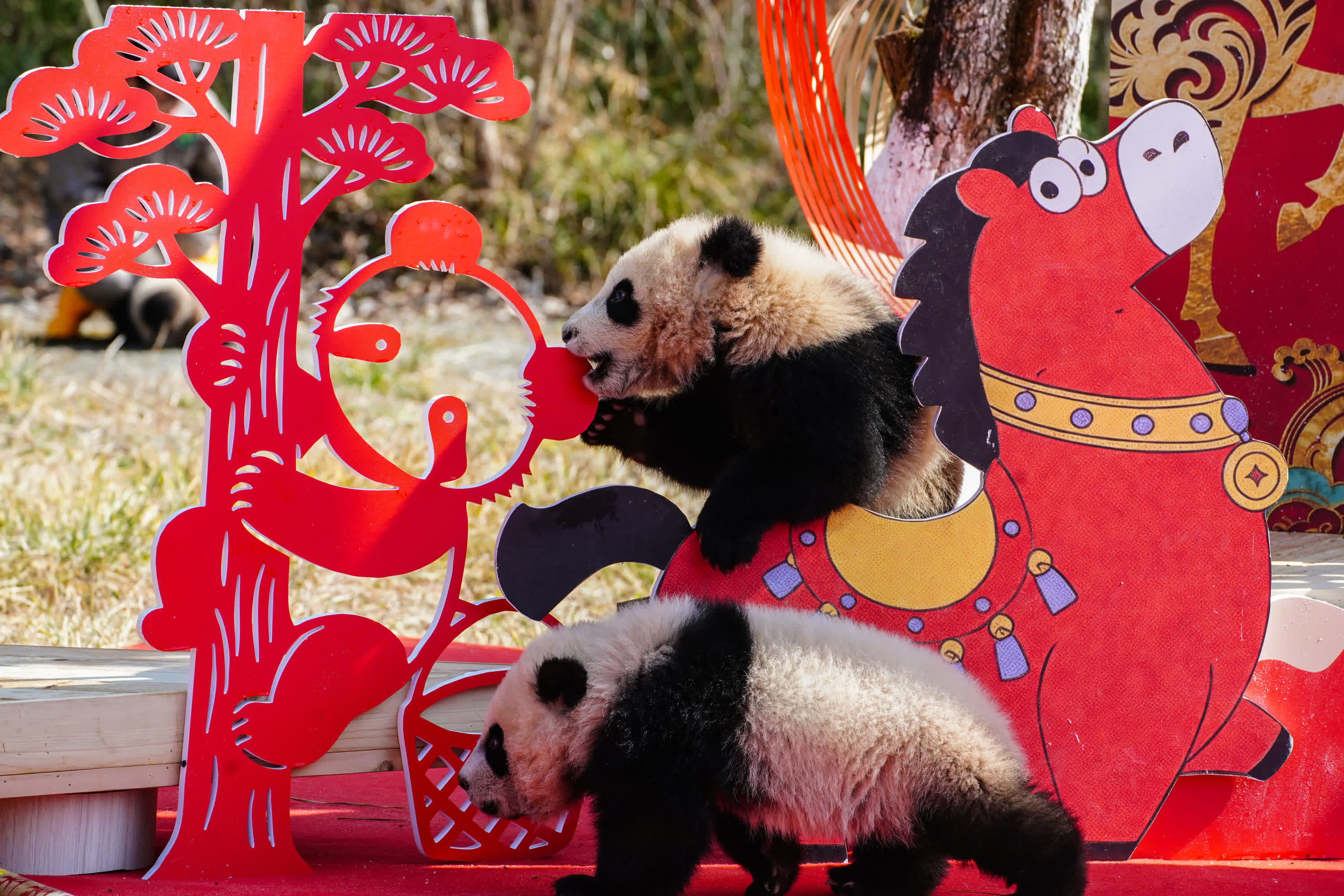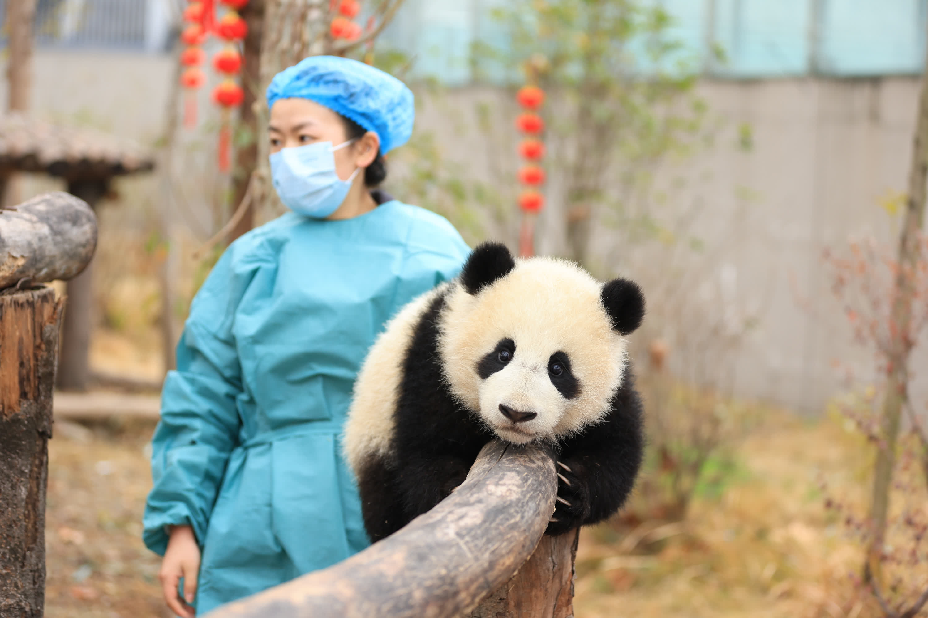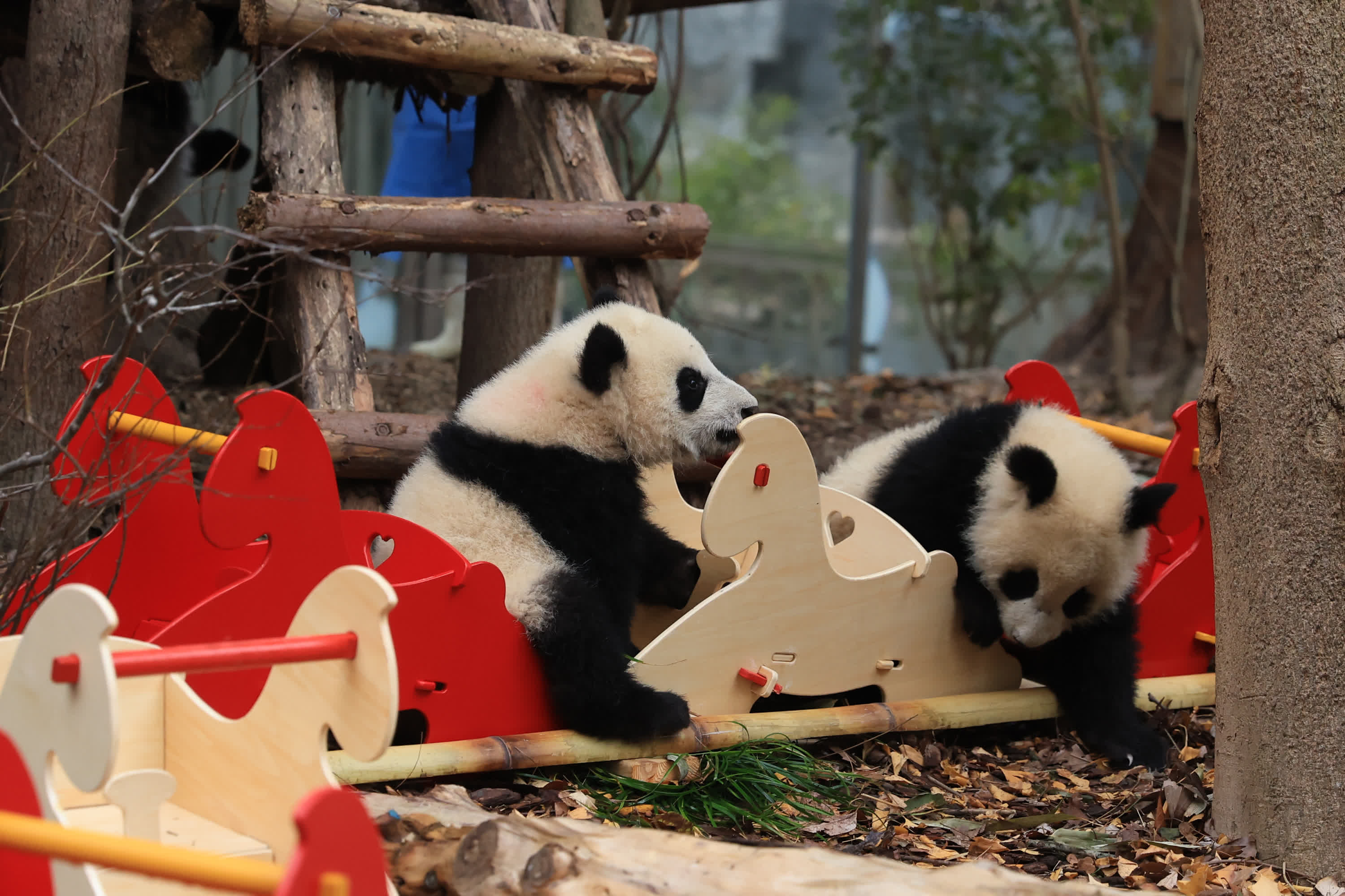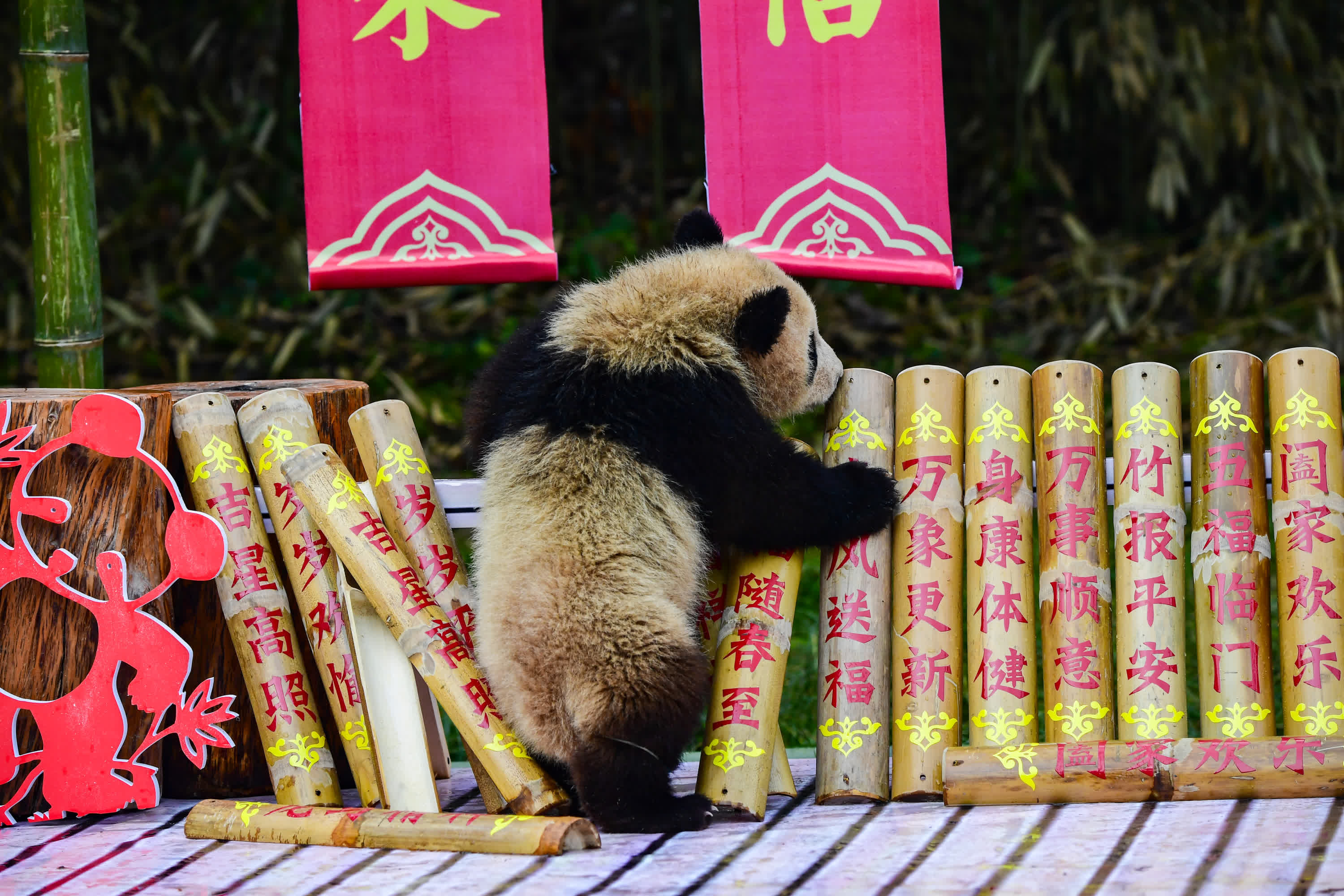 展位上布置了寫滿新春祝福的竹節,寓意團圓的竹編,還有木馬列車等丰容設施,這些設施不僅為熊貓寶寶帶來新的丰容體驗,也進一步烘托出溫馨的節日氛圍。