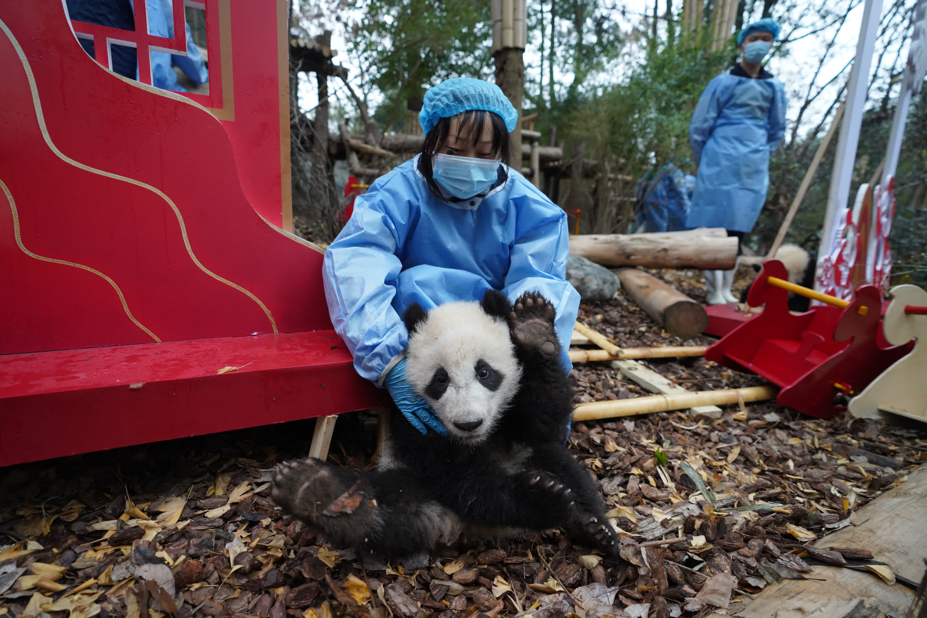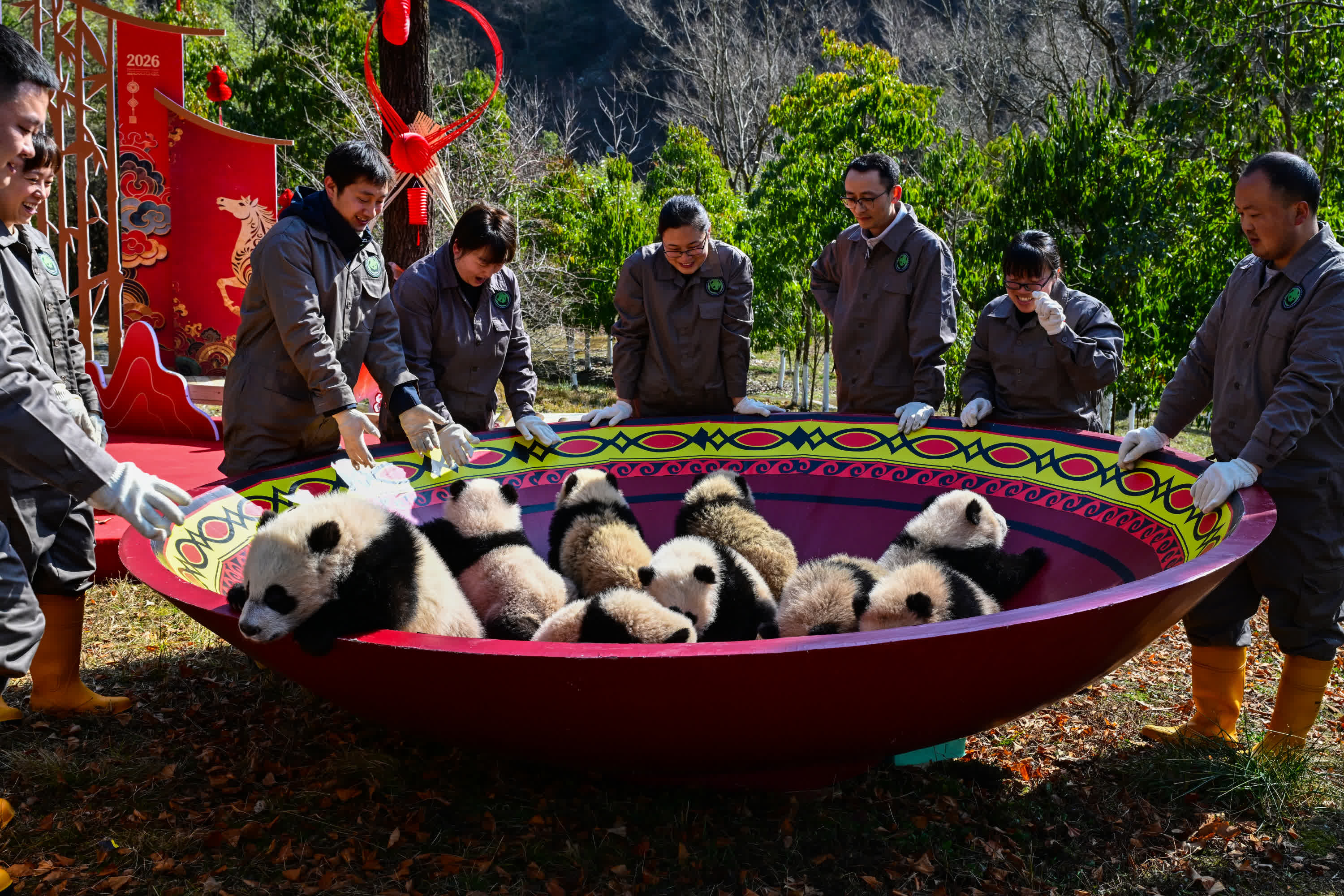 最為吸睛的是飼養員們懷抱熊貓寶寶登場環節,隨着熊貓寶寶們依次亮相,瞬間點燃全場。活潑可愛的小傢伙們各展萌態,有的走近竹編燈籠好奇張望,有的鑽進麻布福袋探出腦袋,有的騎上木馬玩得不亦樂乎,一幅生動的「新春萌趣圖」躍然眼前。