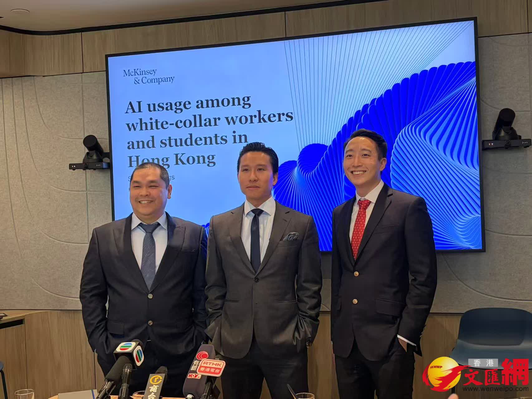 麥肯錫香港分公司合夥人余子健(左)、麥肯錫香港分公司總經理石煒麟(中)及麥肯錫項目經理卞獻中(右)揭示麥肯錫最新AI調查見解。