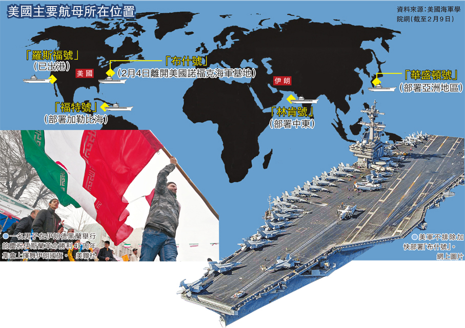 美聯社報道,「布什號」航母上周三離開位於美國東海岸的諾福克海軍基地,進入海上活動。該航母目前正在完成綜合訓練單元演習,距離正式部署還需時數周。按慣例,「布什號」若要完成航母部署資格認證後前往伊朗附近海域,預計最快下月才能抵達,但不排除美軍緊急動員加快部署速度。