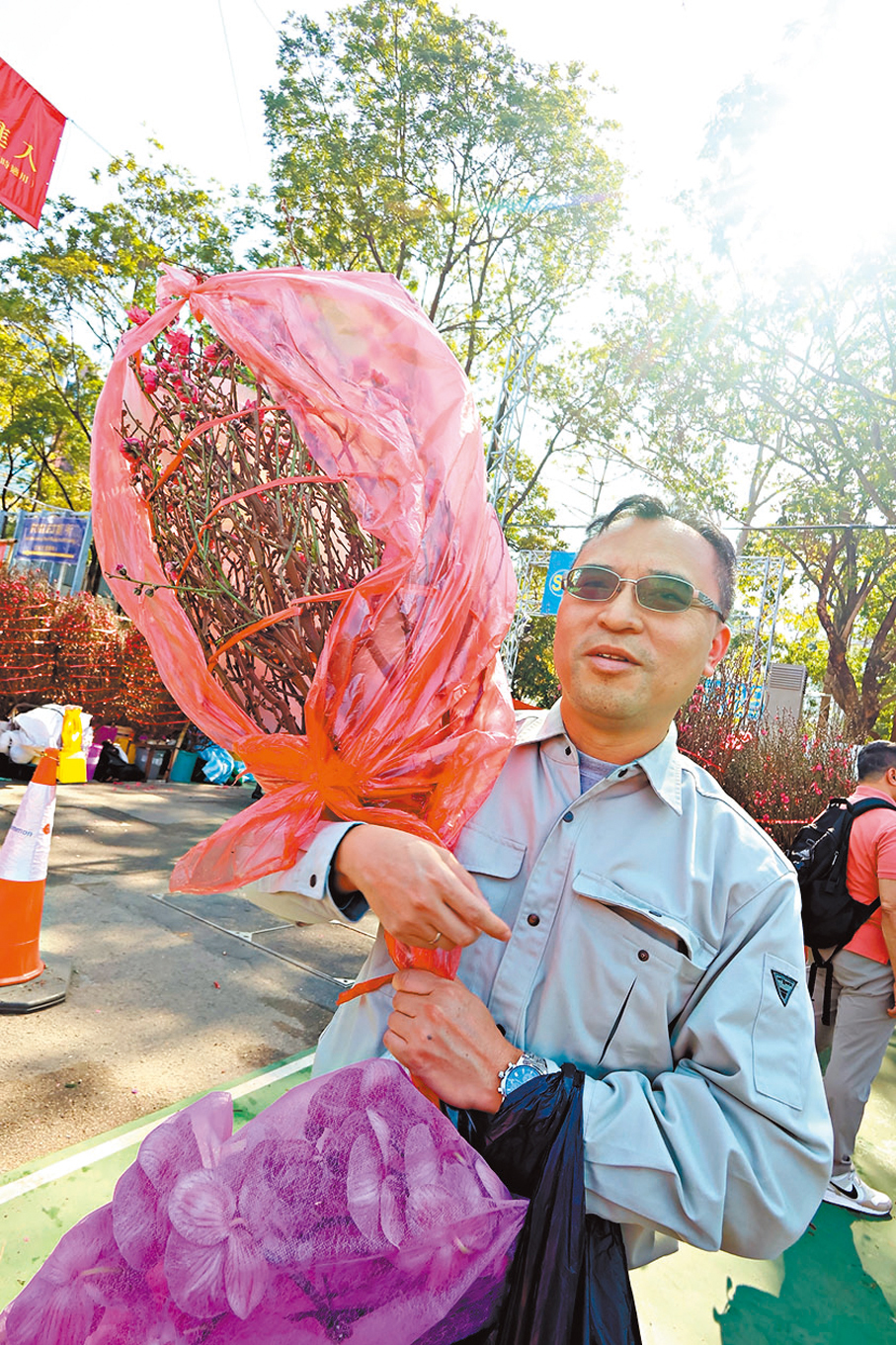 黎先生:我每年都是這個時間(早上10時)來買花,相對不會擁擠。這次主要買了桃花、蘭花和水仙等,預算花千元內,價格方面跟去年沒有太大變化。年花攤檔服務相當周到,職員會協助包紮,對於我這類開車前來的消費者而言採購十分便利。