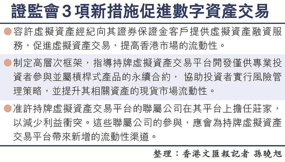 香港鞏固「亞洲加密樞紐」地位走出關鍵一步,Web3界盛事的Consensus Hong Kong 2026在香港會展舉行,香港證監會昨推出3項新措施促進虛擬資產市場發展(見表),包括准許以傳統證券為虛擬資產提供抵押融資服務、向專業投資者提供永續合約,及引入做市商制度;連同去年11月正式落實與全球關聯平台共享掛盤冊,新舉措將虛擬資產與傳統證券市場、香港交易與全球虛擬資產的交易對盤等打通,為本港虛擬資產市場引入充沛流動性。 ●香港文匯報記者 孫曉旭
