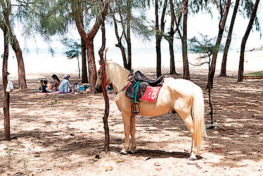 從遠處放眼遼闊的海面,不遠處兩座大小的島嶼就是貓島和鼠島。沙灘的另一邊也豎立着貓和鼠的故事,紀念當地的傳說:貓、鼠、狗隨乘船出海,半途試圖逃回岸上,結果貓和鼠在海中淹沒變成了兩座島嶼,狗游到岸上,變成了沙灘後面的唐觀山。撒米拉海灘上旅客可租用馬匹漫步海灘,有專人指導學習騎馬。