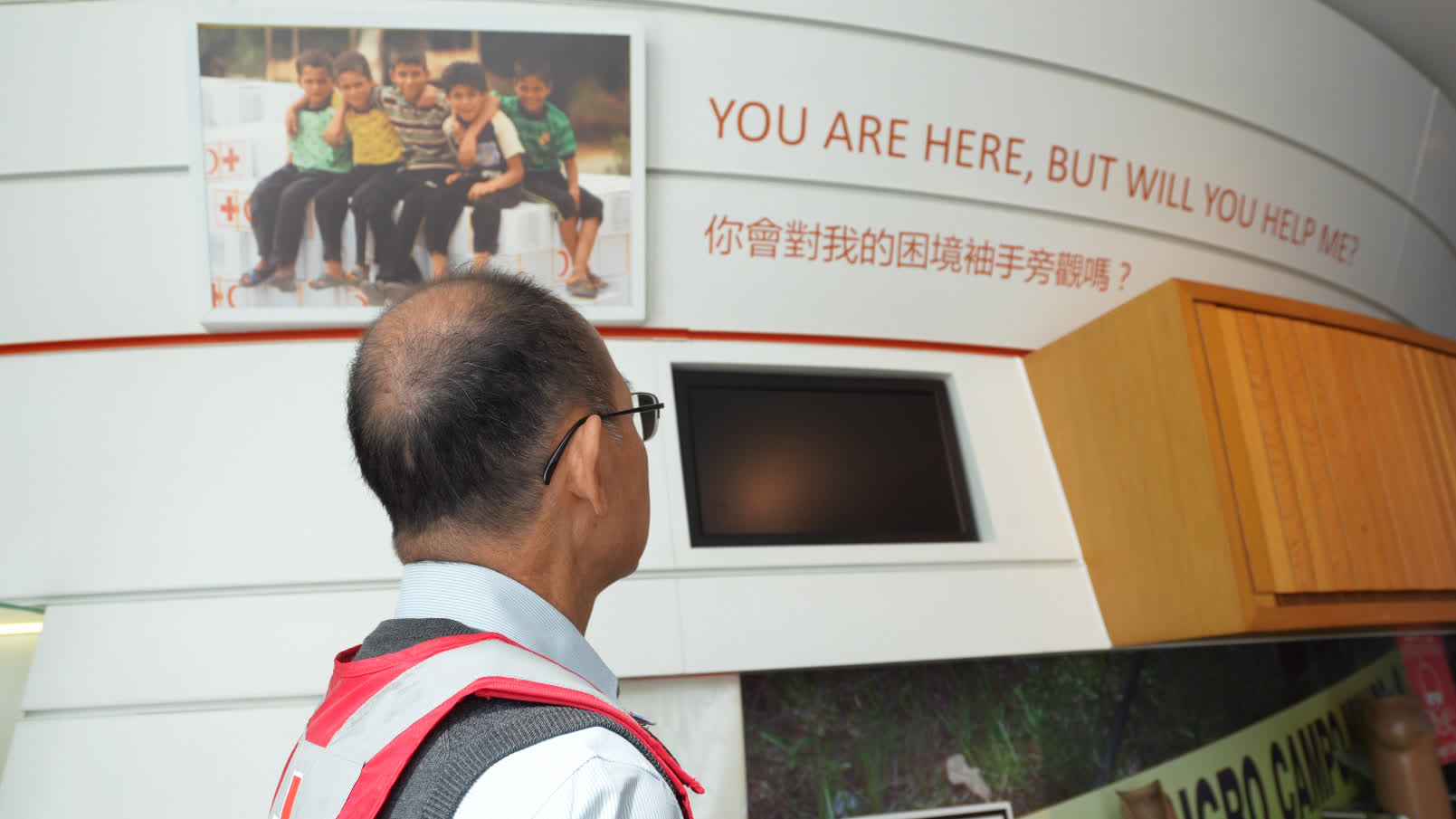 在香港紅十字會總部大樓,牆上的標語寫着:「你會對我的困境袖手旁觀嗎?」歐耀佳說,他很喜歡這句話。