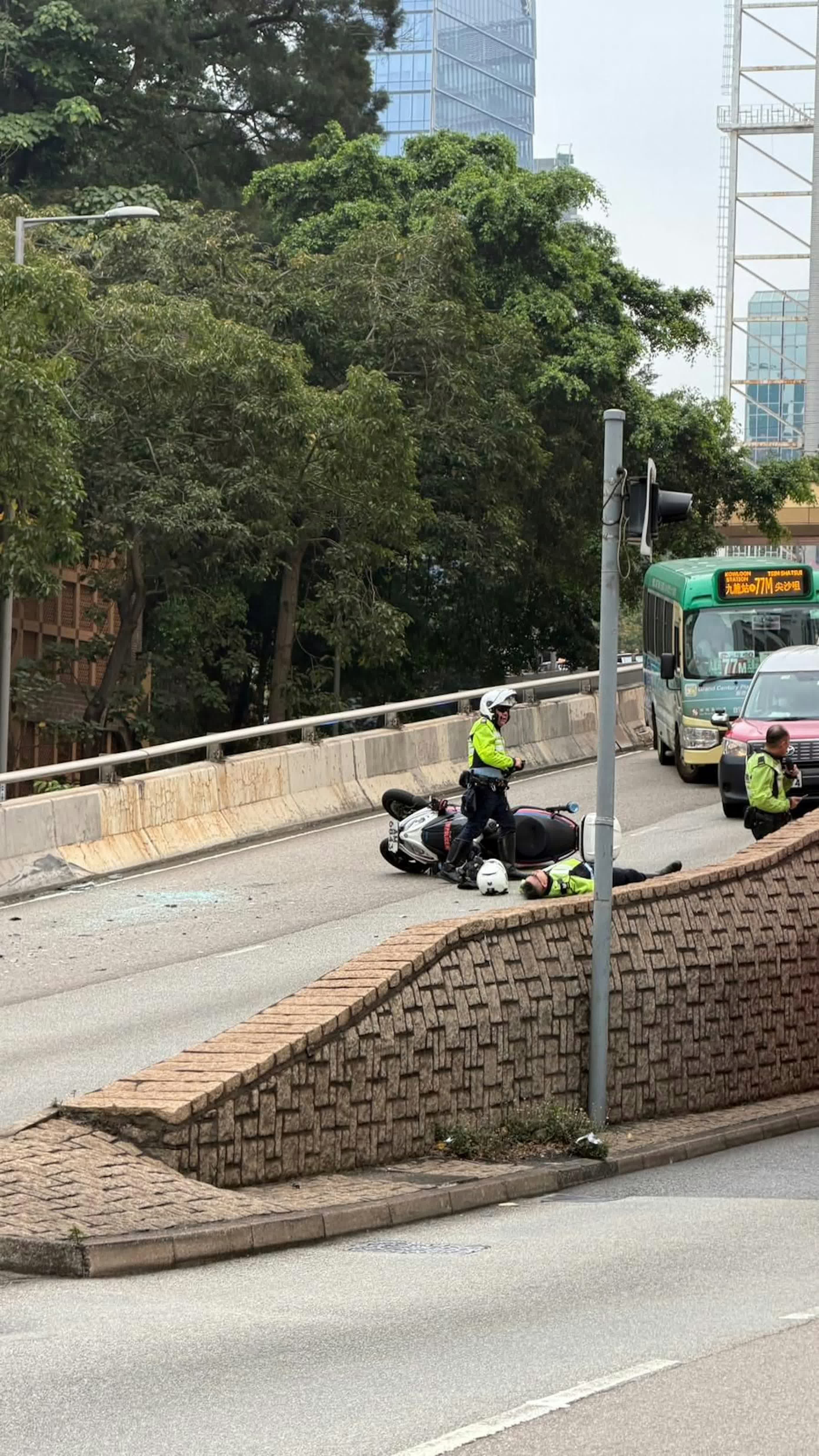 香港文匯報訊(記者 蕭景源)今日(12日)上午10時20分,尖沙咀廣東道中港城對開往油麻地方向的行車天橋落橋位,發生涉及兩輛輕型貨車及一輛客貨車的3車相撞意外,無人受傷。惟在約14分鐘後,一名隸屬西九龍交通部執行及管理巡邏小隊的男警長,駕駛一輛三輪警車到場增援時,警長不慎連車跌倒地上,他腰部受傷,其後被送往廣華醫院治理。警方已列作警察當值受傷案件處理。