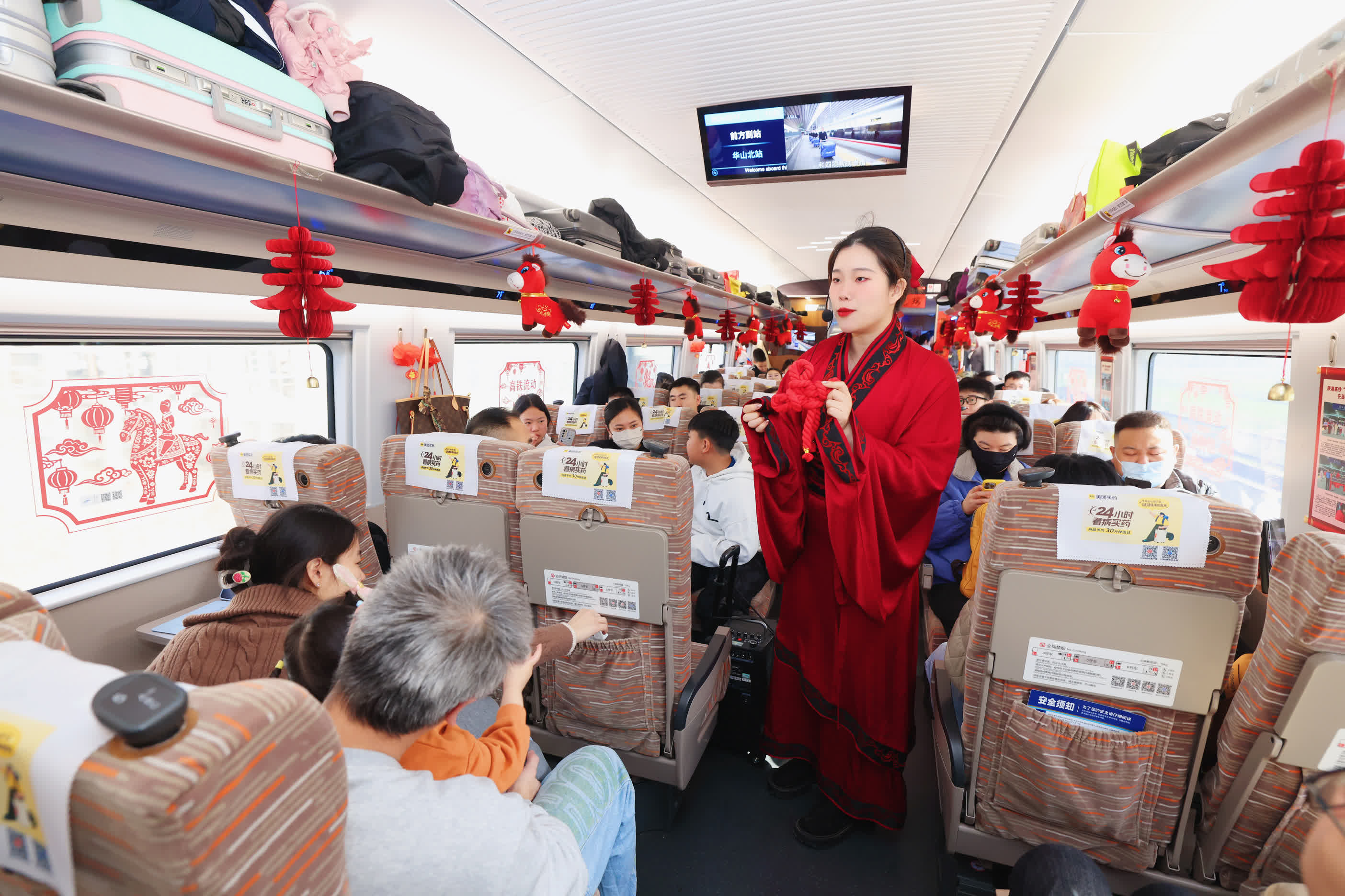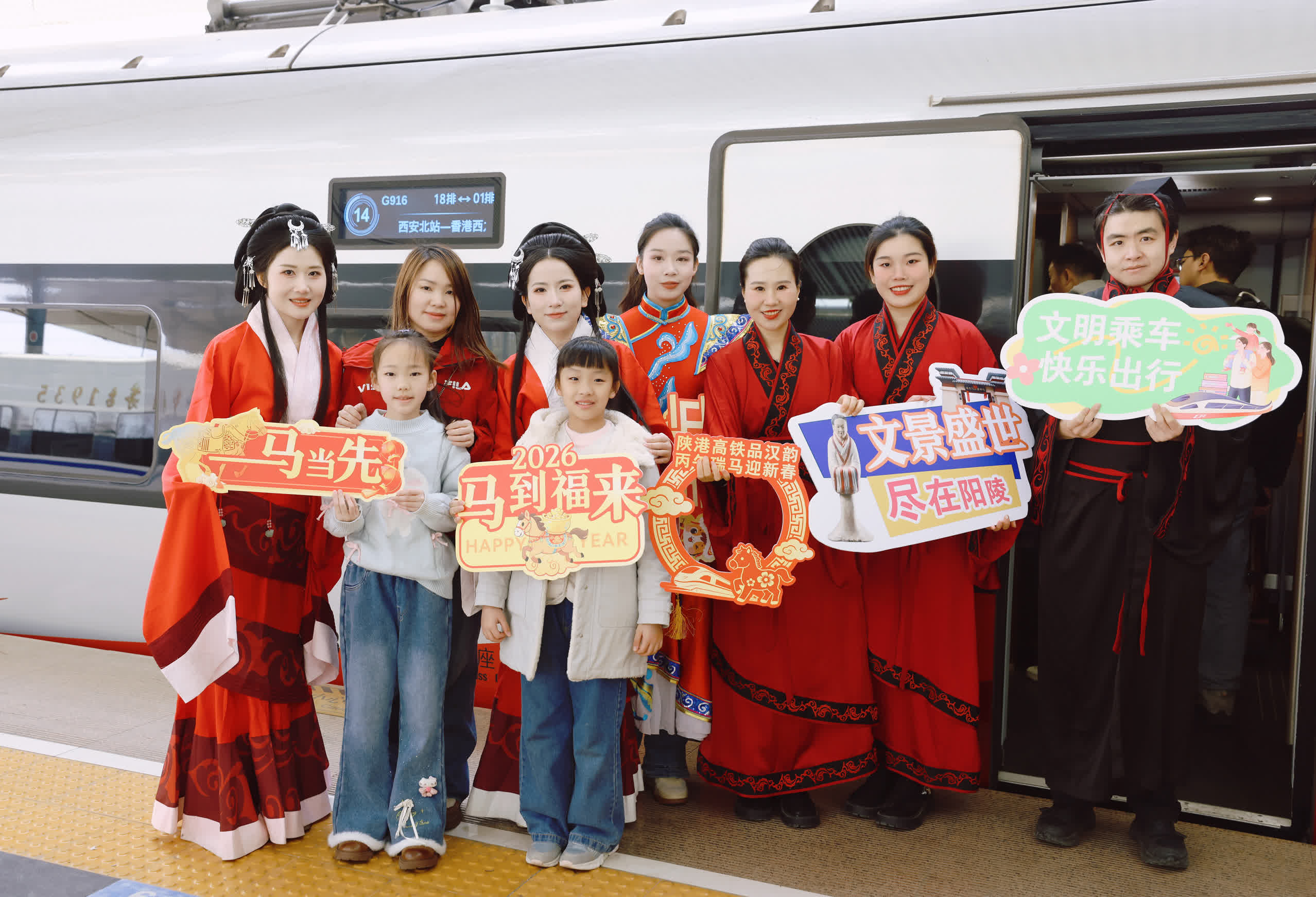 當天西安北站內,漢服工作人員行漢禮迎賓。G916次列車上,工作人員則在餐車吧台及小窗處精心擺放了漢陽陵博物院「彩繪騎馬俑」「塑衣彩繪樂舞女俑」「彩繪陶馬」等與馬年相關的文物複製品和文創展示品,並張貼文物定製特色瑞馬小年車窗貼。值得一提的是,該車窗貼內還配設有視頻、音頻二維碼,以方便旅客掃碼了解更深入的文物故事。此外,車廂內亦布置有馬年吉祥玩偶、春字鈴鐺吊墜、春聯、福字等飾品,彰顯新春味道與漢代文化特色,年味濃濃。