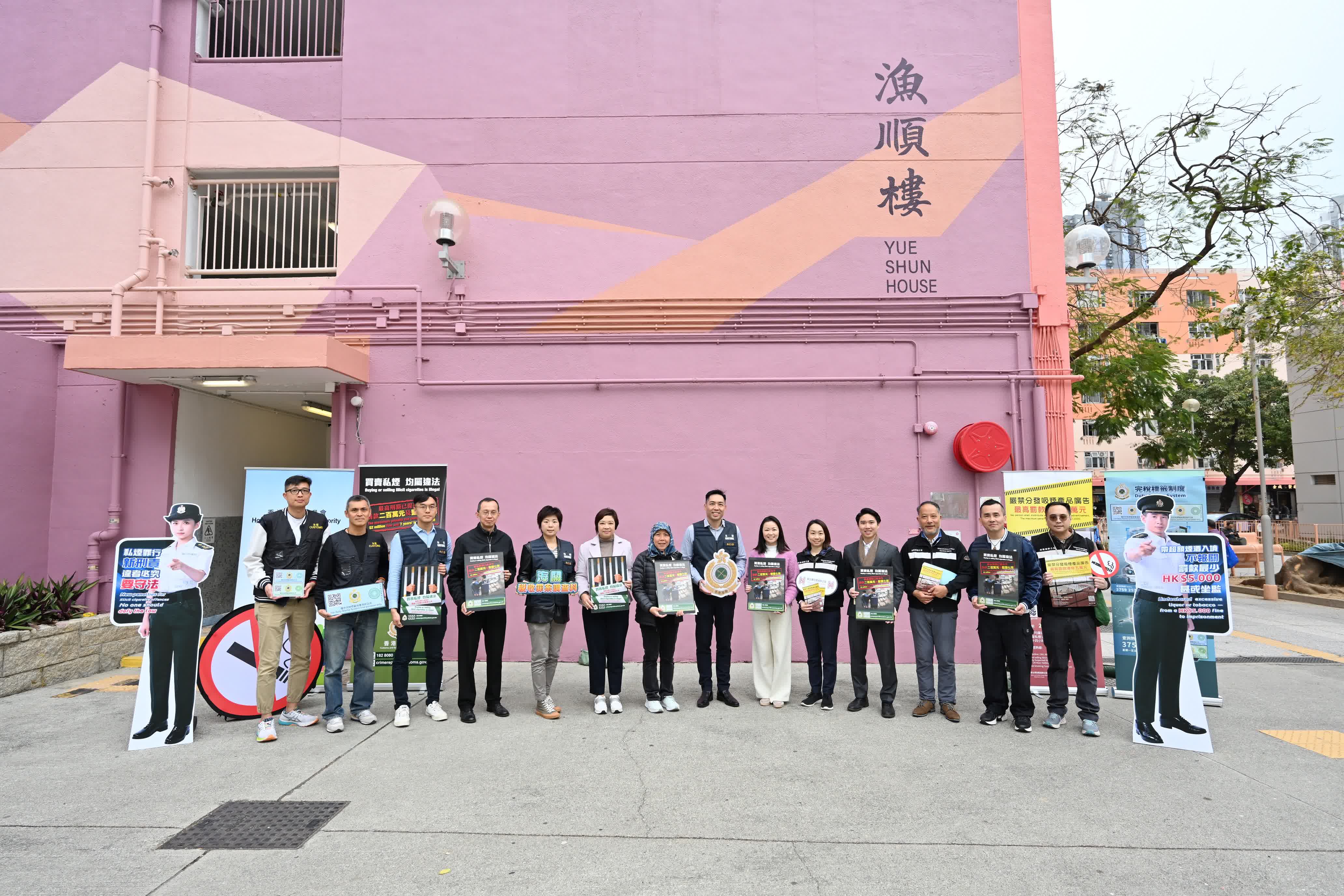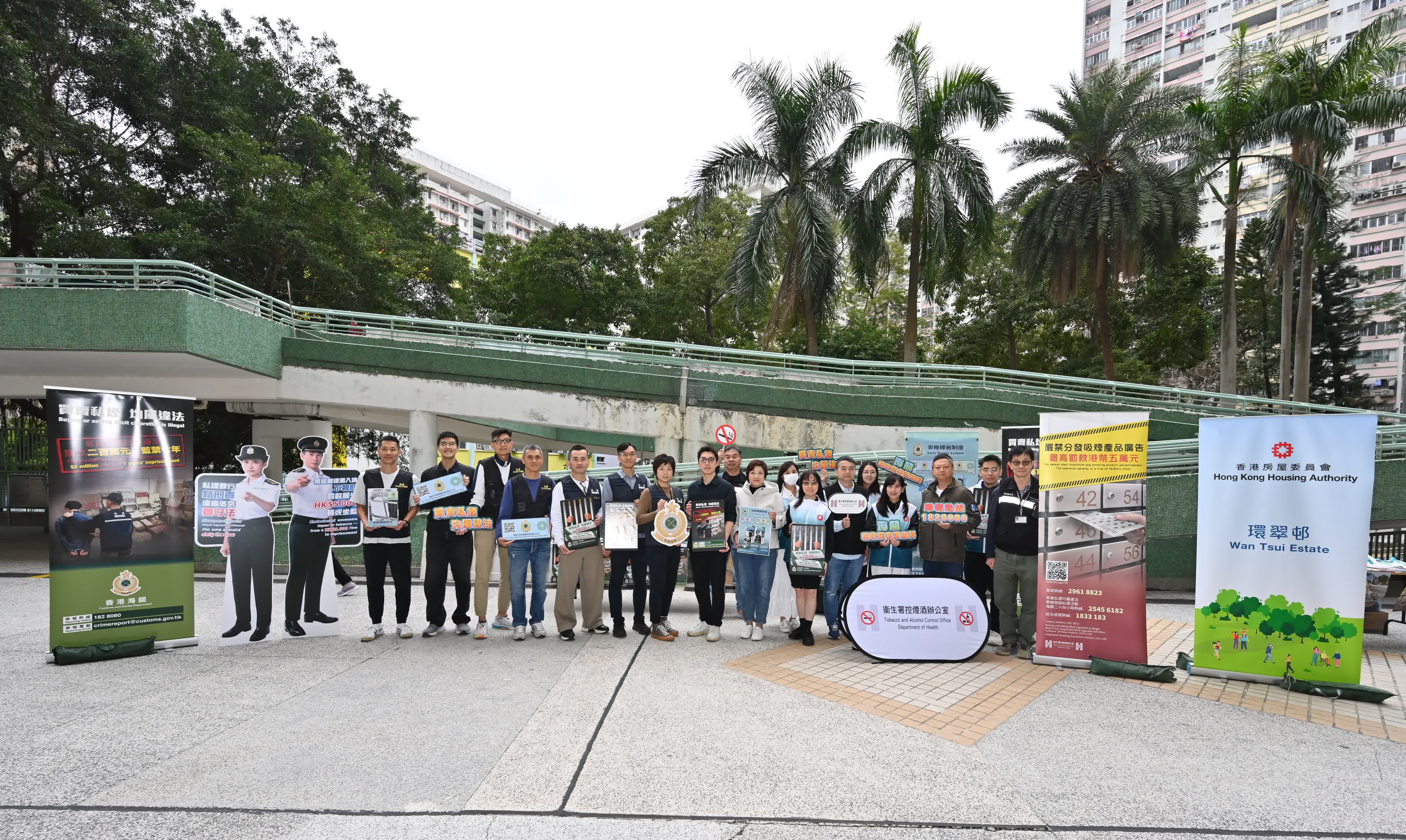 海關人員於屋邨範圍內巡查及向居民介紹海關打擊私煙的工作和私煙相關法例的新修訂,包括未完稅煙草相關罪行的最高罰則已提高至罰款200萬元及監禁7年,並向屋邨保安員講解發現懷疑私煙活動時的應對方法。