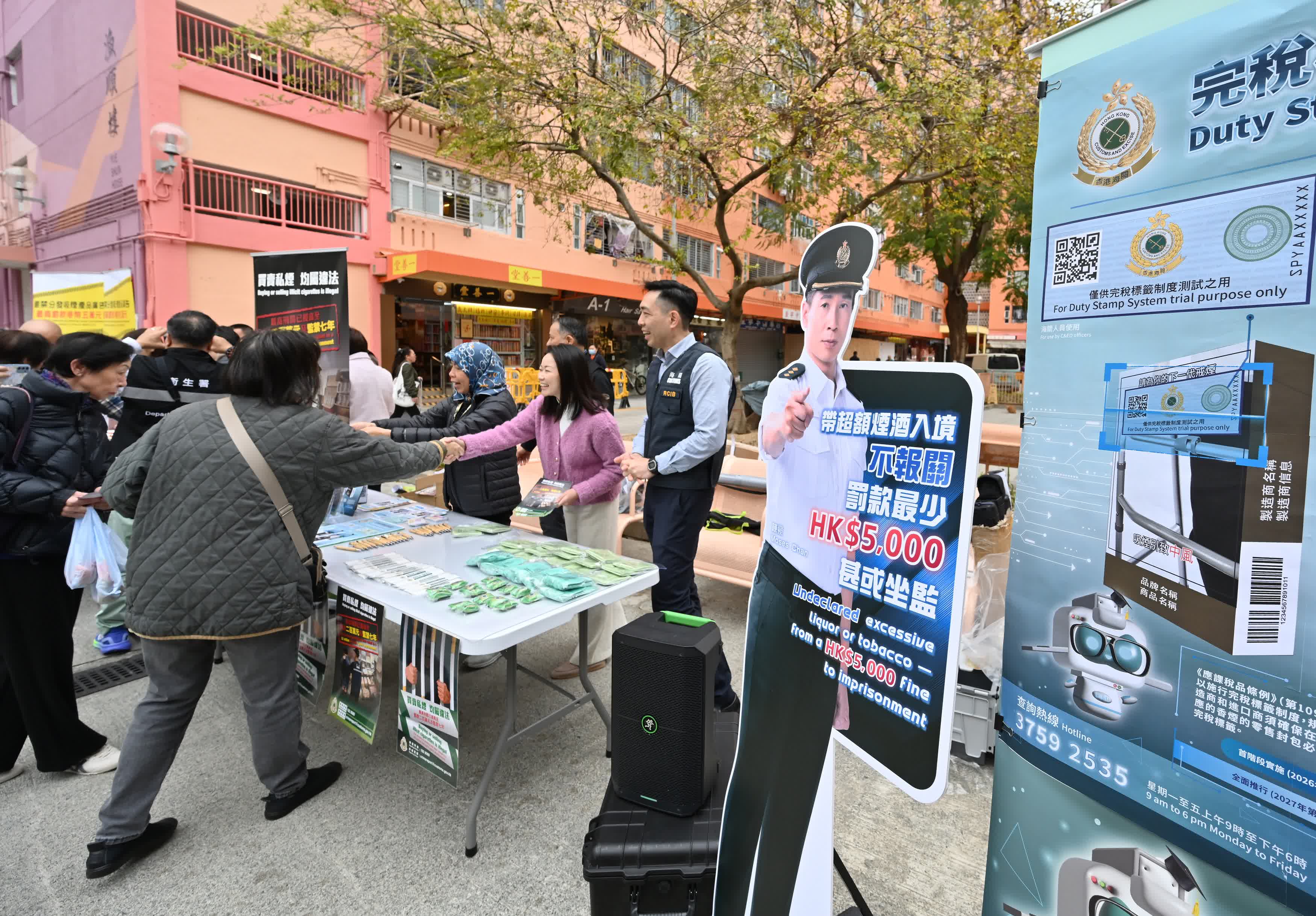 海關人員亦向議員、居民、報販及香煙零售商簡介香港將施行的完稅標籤制度。海關推出為期3個月的完稅標籤制度先導計劃已於本年初完成,海關會繼續與各持份者保持緊密溝通,持續優化制度設計及執行細節。海關計劃於今年第四季實施首階段的完稅標籤制度,並於2027年第二季全面推行有關制度,期望有效區分已完稅和未完稅香煙,打擊「白牌煙」。