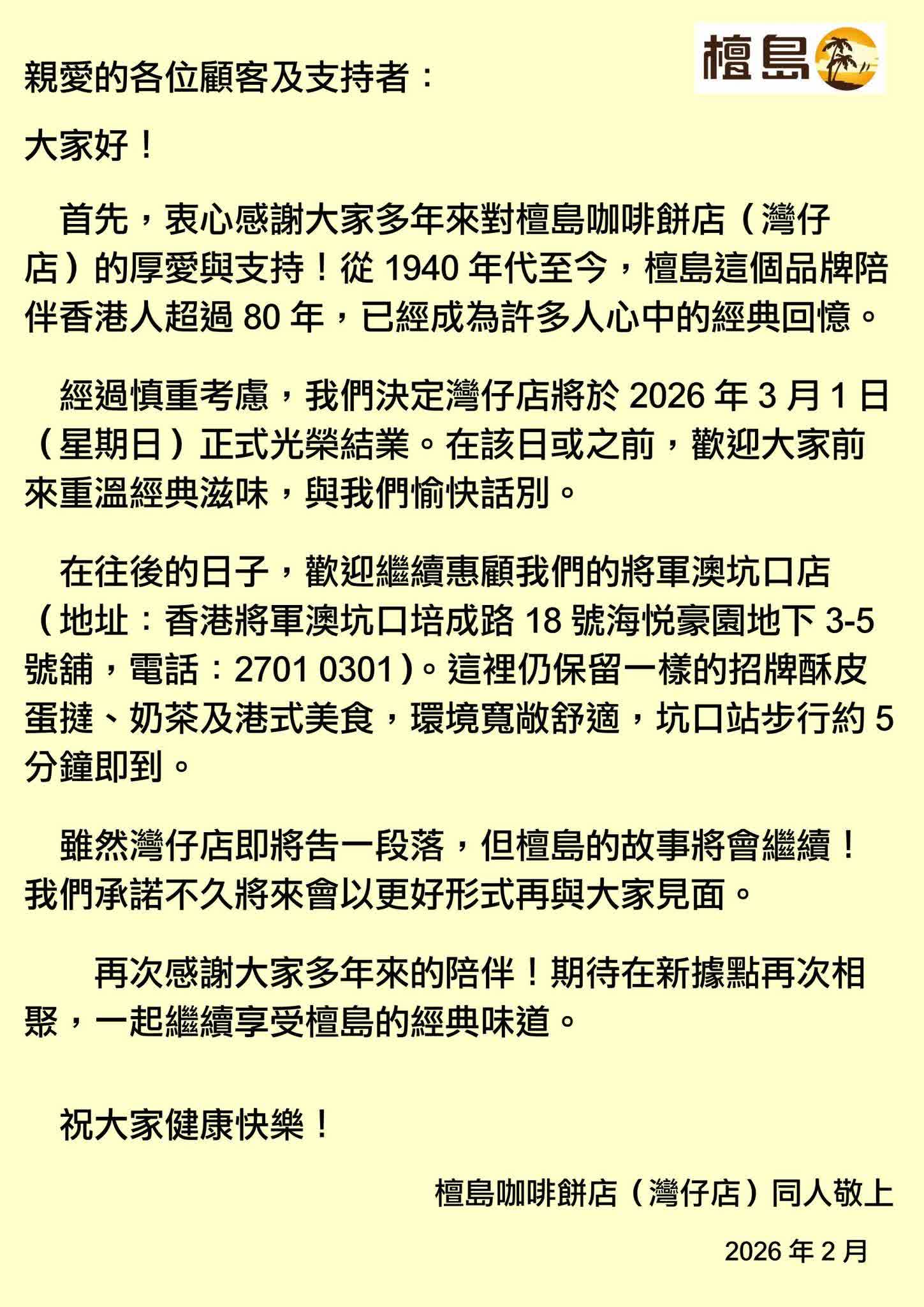 香港文匯報訊:有80年歷史的檀島咖啡餅店灣仔店,在社交媒體Facebook宣布,經過慎重考慮作出結業決定,將於3月1日(星期日)正式光榮結束營業。該店衷心感謝市民多年來的厚愛和支持,表示「在該日或之前,歡迎大家前來重溫經典滋味,與我們愉快話別」,並期待在新據點再次相聚,往後會繼續經營將軍澳坑口店。