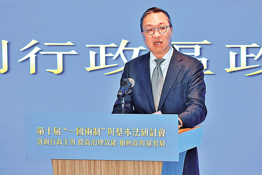 香港文匯報訊(記者 盧慧穎)以「落實行政主導 提高治理效能 推動高質量發展」為主題的第十屆「一國兩制」與基本法研討會2月10日在港舉行。與會的國務院港澳事務辦公室原副主任、全國港澳研究會會長鄧中華致辭時表示,行政主導體制有利於維護國家根本利益,有利於促進港澳經濟繁榮發展,有利於維護特區整體利益和長遠利益。香港特區政府律政司司長林定國致辭時表示,行政主導的重點在於,雖然行政、立法和司法機關各有分工,但根本目的都是為了保障香港特區整體利益和廣大香港市民的福祉。