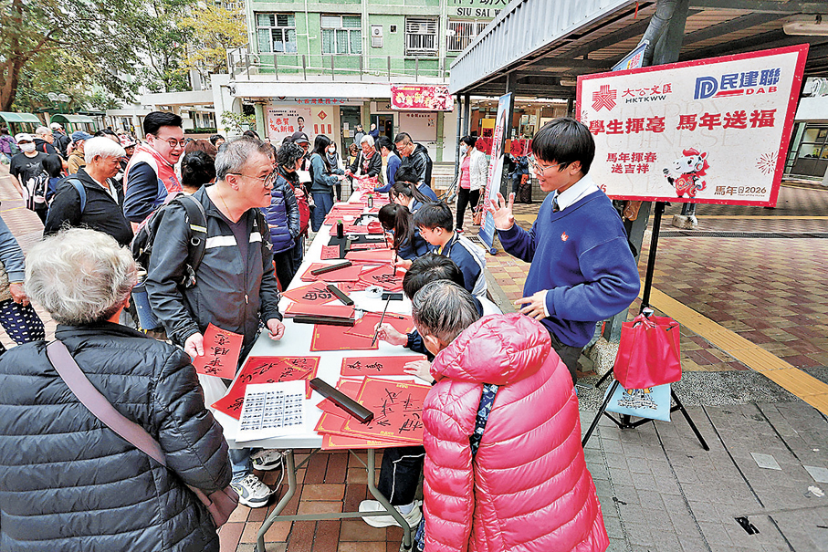 香港文匯報訊(記者 崔瀅)新春將至,年味漸濃。香港大公文匯傳媒集團與民建聯再度合辦「學生進社區寫揮春」活動,昨午於小西灣、觀塘坪石邨及將軍澳翠林邨同步舉行。今年特別邀請香島中學、麗澤中學、福建中學(小西灣)、中華基金中學及將軍澳香島中學的學生即席揮毫,為街坊手寫揮春,送上新春祝福。現場氣氛熱烈,吸引大批市民排隊索取,不少街坊大讚學生字跡工整有力,更表示手寫揮春比印刷品更有溫度、更具年味。