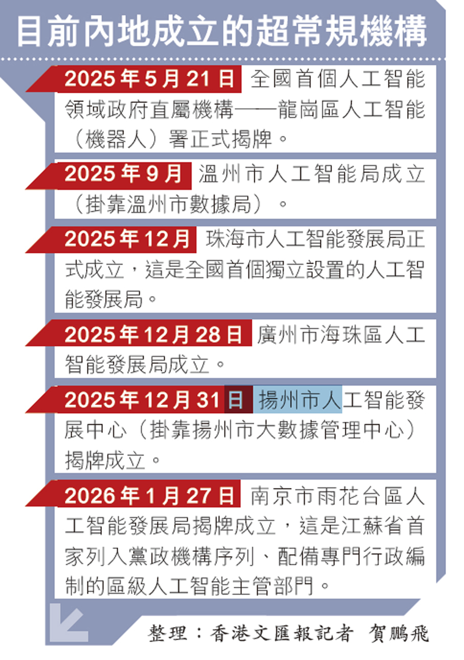 香港文匯報訊(記者 賀鵬飛 南京報道)年末歲首,一場關於人工智能治理的制度性變革在長三角、珠三角悄然展開。廣東珠海市、廣州海珠區、南京雨花台區等地相繼設立獨立履職的「超常規機構」——人工智能發展局,這標誌着人工智能正式升維為城市核心戰略,同時也意味着地方政府正嘗試以「超常規」的制度設計,搶佔人工智能產業新賽道。