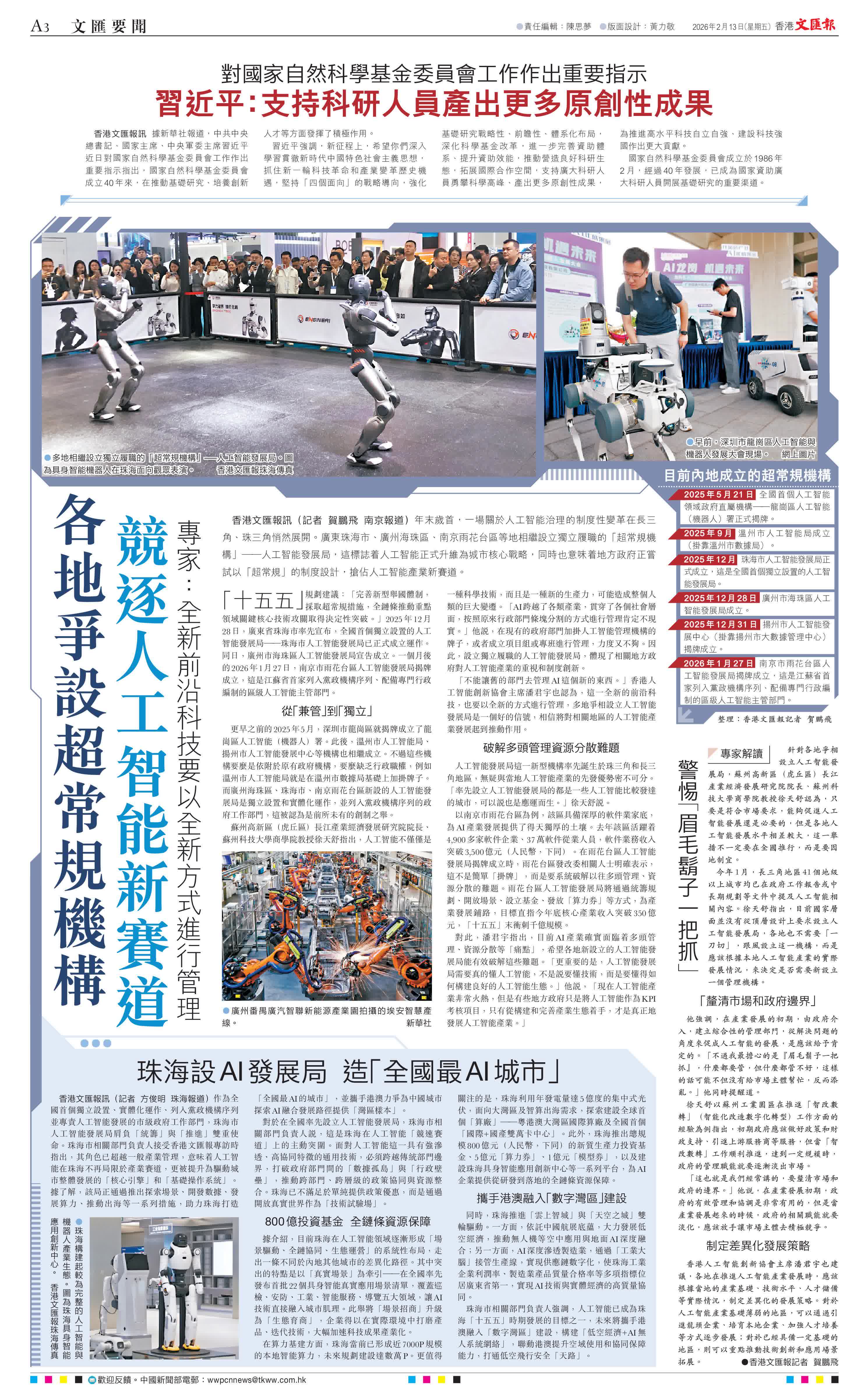 香港文匯報訊(記者 賀鵬飛 南京報道)年末歲首,一場關於人工智能治理的制度性變革在長三角、珠三角悄然展開。廣東珠海市、廣州海珠區、南京雨花台區等地相繼設立獨立履職的「超常規機構」——人工智能發展局,這標誌着人工智能正式升維為城市核心戰略,同時也意味着地方政府正嘗試以「超常規」的制度設計,搶佔人工智能產業新賽道。