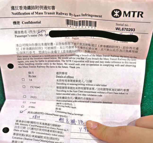 講粗口隨時被罰錢?有網民在社交平台分享,港鐵範圍內講粗口,被職員開罰單,警告再犯會罰款5000元,帖文並附有罰單圖片為證。港鐵回覆媒體查詢,事件發生在1月23日寶琳站,職員在處理一宗乘客爭執時,曾向相關乘客發出了書面警告,即「違反香港鐵路附例通知書」。
