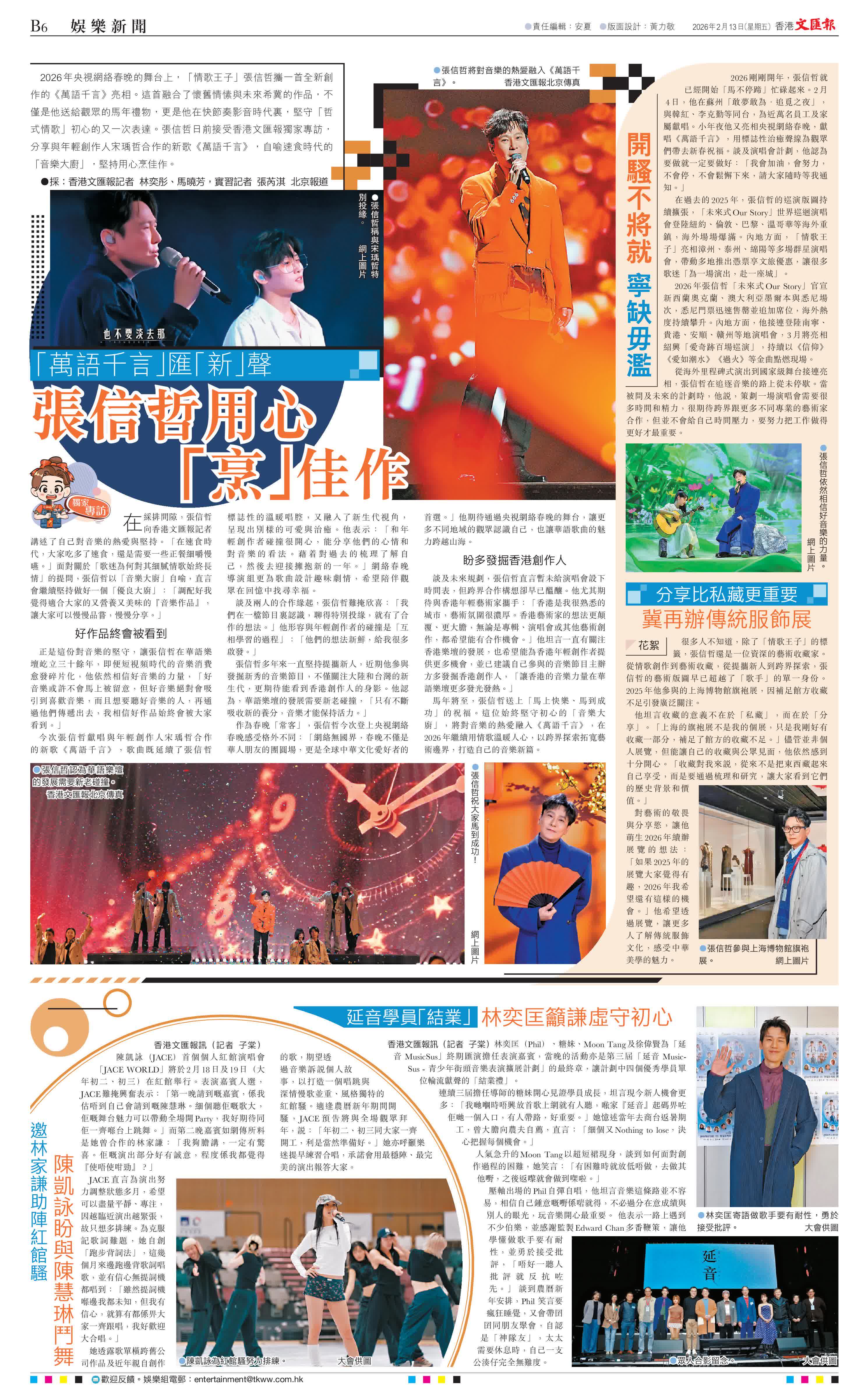 (香港文匯報記者 林奕彤、馬曉芳 實習記者 張芮淇 北京報道)2026年央視網絡春晚的舞台上,「情歌王子」張信哲攜一首全新創作的《萬語千言》亮相。這首融合了懷舊情愫與未來希冀的作品,不僅是他送給觀眾的馬年禮物,更是他在快節奏影音時代裏,堅守「哲式情歌」初心的又一次表達。張信哲日前接受香港文匯報獨家專訪,分享與年輕創作人宋瑀哲合作的新歌《萬語千言》,自喻速食時代的「音樂大廚」,堅持用心烹佳作。