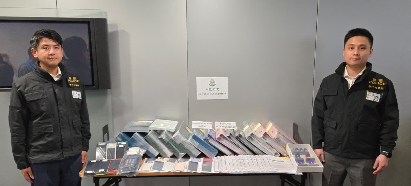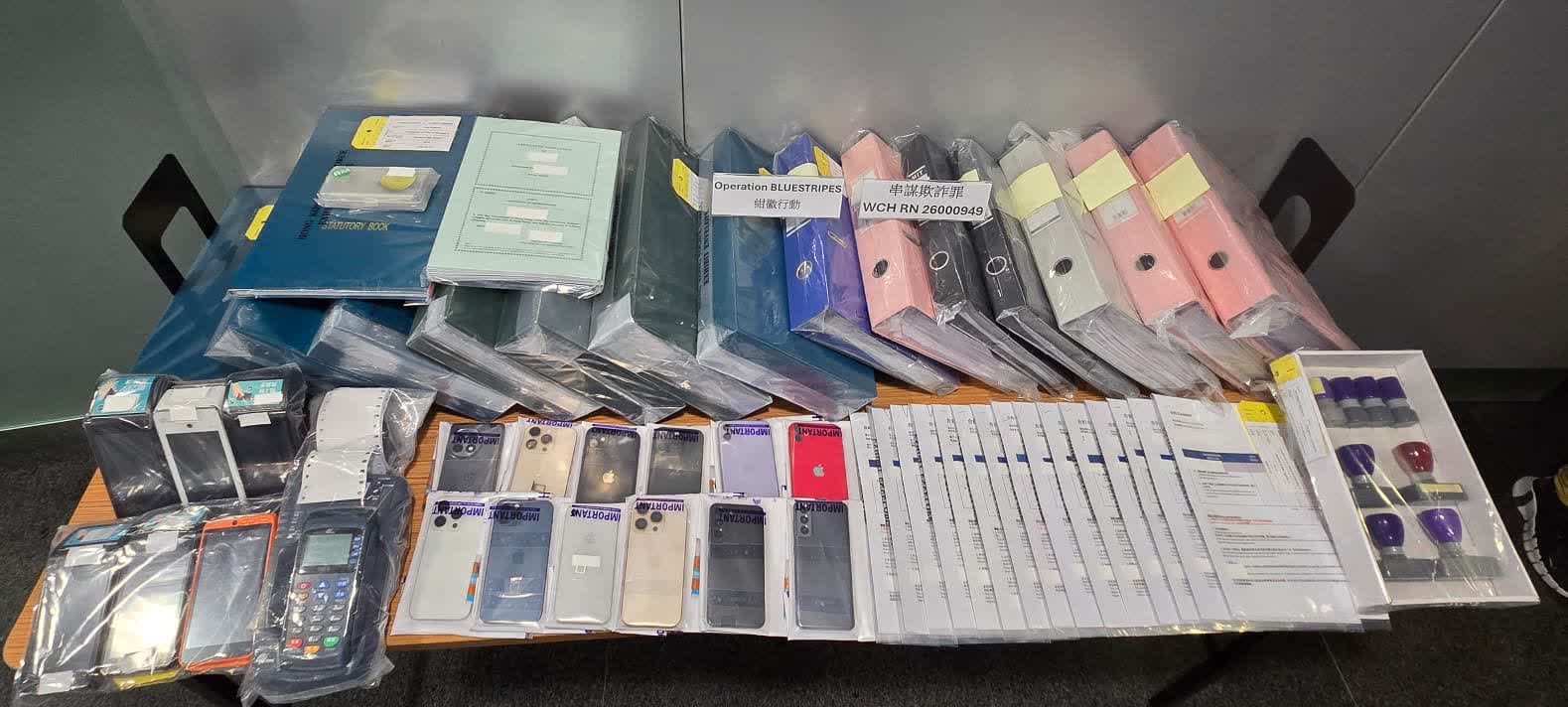 被捕21人(12男9女),年齡介乎25歲至59歲,包括7名骨幹成員、5名銷售員及9名傀儡戶口持有人, 分別報稱文員、會計、公司董事及無業,涉嫌「串謀欺詐」罪名,通宵扣查。