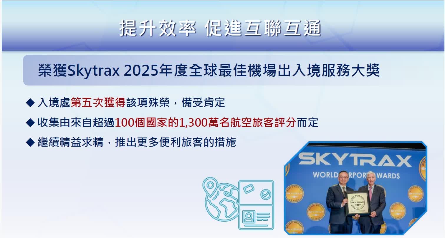 香港文匯報訊(記者 蕭景源)入境處一直致力為旅客提供便捷出入境服務,入境處在國際專頁航空運輸研究機構Skytrax年度旅客意見調查中,榮獲2025年度全球最佳機場出入境服務大獎,該調查覆蓋全球接近600個機場,收集逾1,300萬名來自超過100個國家的航空旅客,對不同機場出入境服務的評分。今次是入境處第五次獲得此項殊榮,肯定了入境處一直以來提供優質出入境服務的努力。