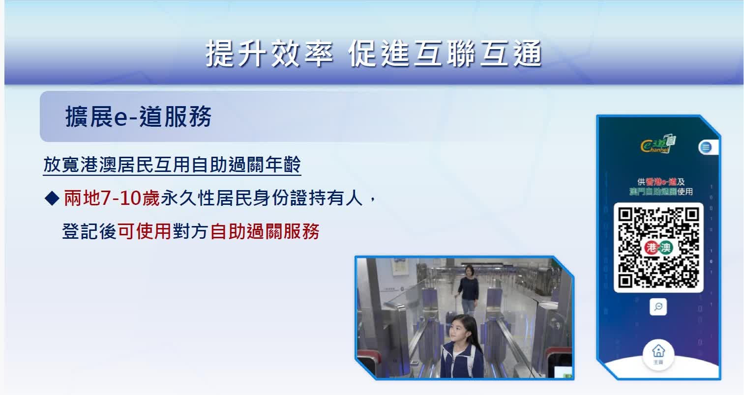 面對屢創新高的旅客流量,入境處持續運用創新科技,推出多項便利旅客的措施,提供更優質、更高效的出入境服務。在2025年9月,入境處在香港國際機場推出「容易飛e-道」服務,讓合資格香港居民,透過容貌識別技術,完成整過入境檢查手續,毋須出示證件或非觸式e-道的加密二維碼,自推出以來,使用該服務的香港居民人次,已經約有36萬。另一方面,入境處進一步放寬e-道的使用年齡,以提升通關效率,入境處在去年先後調整持有智能身份證的香港永久性居民、中國電子普通護照的過境旅客,以及持有電子往來港澳通行證及使用「離境易」服務的訪客,使用e-道服務的合資格年齡,由11歲放寬至7歲或以上,截至2025年年底,相關擴展服務的使用人次約108萬。今年一月,入境處更讓年齡介乎7至10歲、並持有有效澳門永久性居民身份證的澳門居民,可以在登記後使用香港e-道服務,進一步令更多訪客可以享受便捷的自助通關服務。
