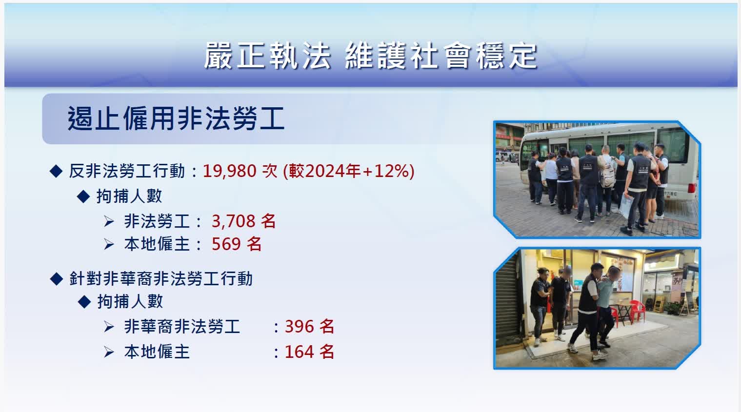 香港文匯報訊(記者 蕭景源)入境處一直致力打擊非法勞工,保障本地工人就業機會,作為跨部門反黑工專責組成員,入境處全力支援專責組加強跨部門協調,多管齊下打擊非法勞工問題。2025年,入境處進行了共2萬次反非法勞工行動,較2024年增加約12%,行動中,入境處共拘捕3,700名非法勞工,以及570名本地僱主。當中針對打擊非華裔非法勞工行動,入境處共拘捕400名非華裔非法勞工,以及約160名聘用他們的本地僱主。被定罪的非法勞工,大部分被判監,最高被判囚22個月兩星期;而被定罪的僱主,部分被判監或罰款,最高被判囚6個月,而罰款金額最高達6萬港元。