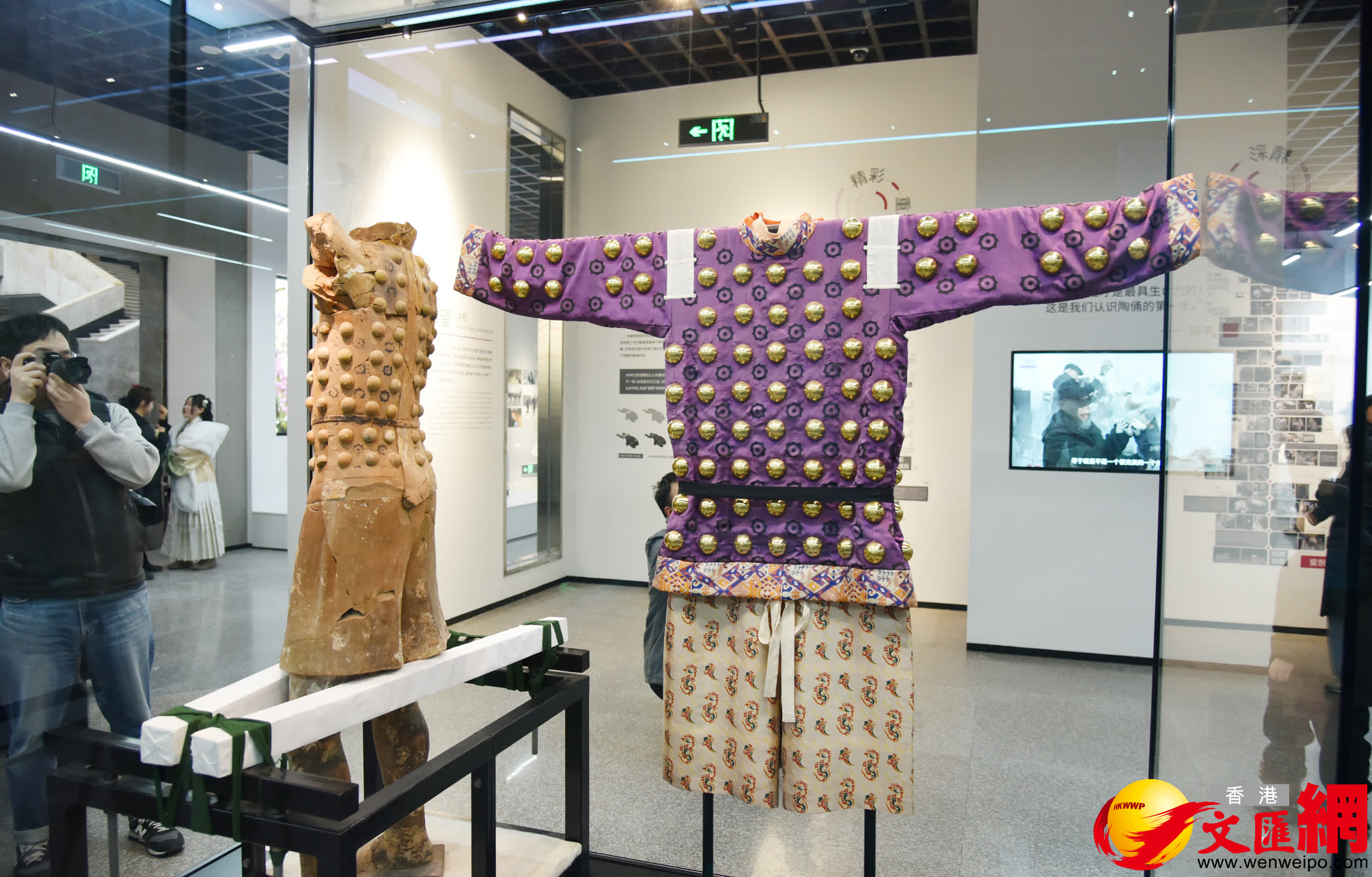 其中4號百戲俑與其復原服飾一起展示,引人關注。根據4號百戲俑《修復日記》顯示,這件百戲俑通高157厘米,重85.53公斤,身上曾遍布彩繪,穿着有裝飾泡釘的精美服飾。文物保護工作者深入挖掘相關信息,經過細緻研究和反覆推敲,成功復原了這件服飾,並首次公開展出。