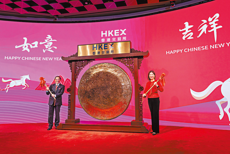 港交所主席唐家成及行政總裁陳翊庭昨日向股民拜早年,兩人還拉着兩匹駿馬預祝股民馬年吉祥如意、龍馬精神、馬到成功。陳翊庭表示,港交所去年推出了多項改革措施,建設多元產品生態圈,預期將為香港市場帶來更多機遇與活力。唐家成則說,馬是充滿了力量與鬥志,展望馬年,港交所會繼續擔當「超級聯繫人」的角色,帶領香港市場蓬勃發展、「馬力全開」,與市場各界攜手迎接更大的機遇。