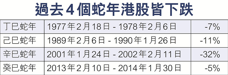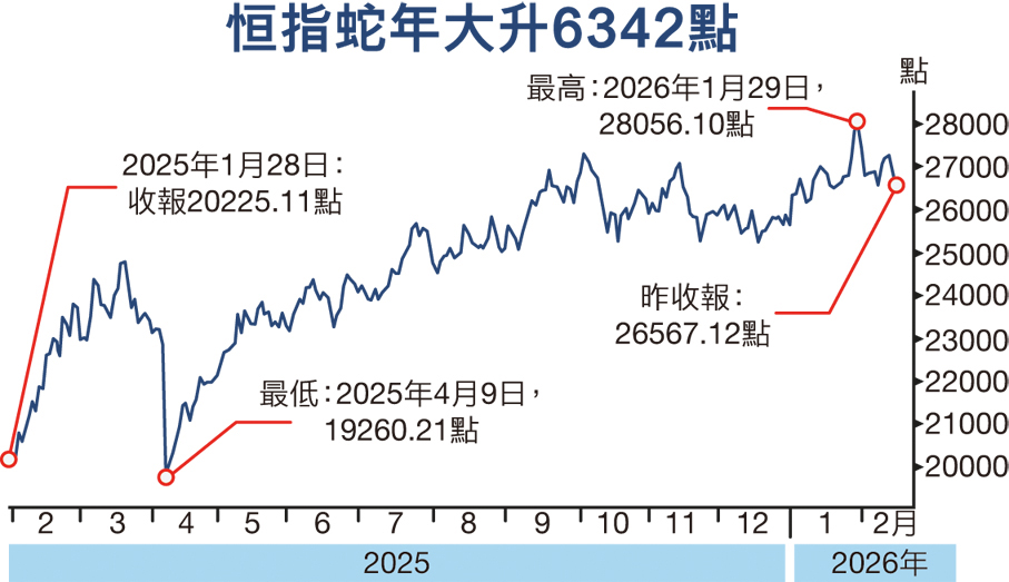 市場下周將「送蛇迎馬」,回顧今年蛇年,在環球貿易環境改善、港美減息、中資科技股帶動港股估值修復、資金持續流入本港等大好形勢下,香港經濟表現勝預期,股市、樓市成交暢旺。恒指升約31%,連升第二個農曆年,較龍年的28%升幅更佳。樓市升近8%,扭轉連跌3個農曆年的頹勢。展望馬年,港交所主席唐家成昨日表示,港交所將「馬力全開」,與市場各界攜手迎接更大的機遇。 ●香港文匯報記者 周紹基