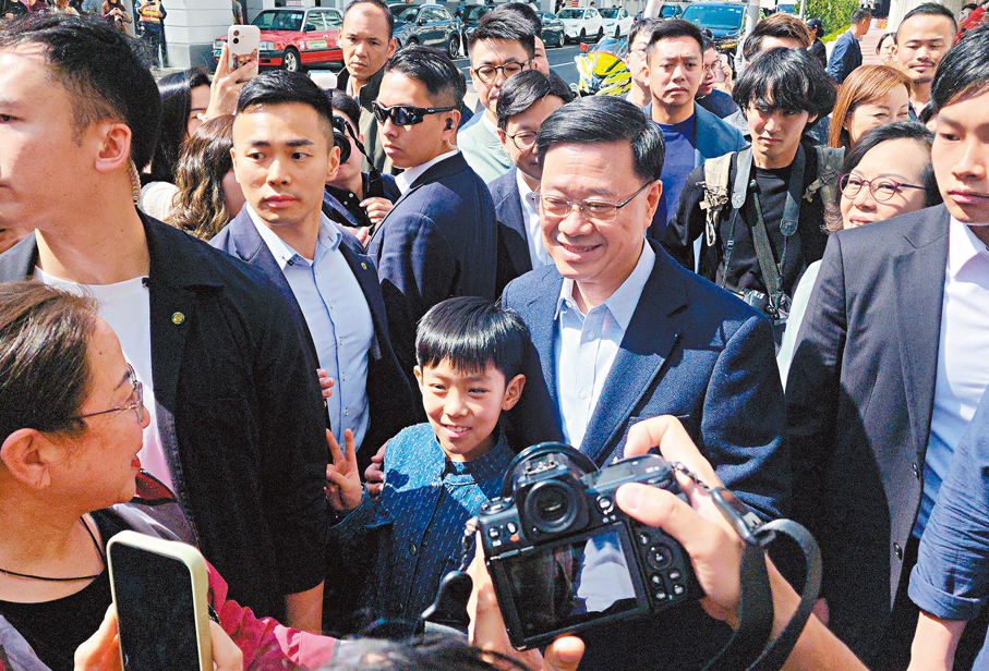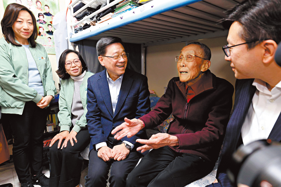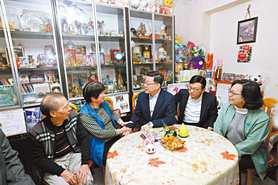 新春佳節將至,特區行政長官李家超,及特區政府一眾主要官員由昨日(13日)起一連4天走訪全港十八區探訪不同家庭。昨日,李家超先後到訪啟德「啟航1331」的「青年驛站」探望受宏福苑火災影響的居民,以及到油麻地駿發花園家訪長者,又到長者社區服務中心與「老友記」們齊聲高歌,樂也融融。李家超在會見傳媒時表示,是次落區主要是想了解長者在居家安老方面的需要,即使此行看到有長者對地區生活配套滿意,令人欣慰,但特區政府仍會以「沒有最好,只有更好」的精神改善服務。他強調,地區工作是其施政中的一個重點,必須充分掌握社區的氣氛,特別要照顧多年來為香港發展貢獻了力量的長者。 ●香港文匯報記者 黃子晉