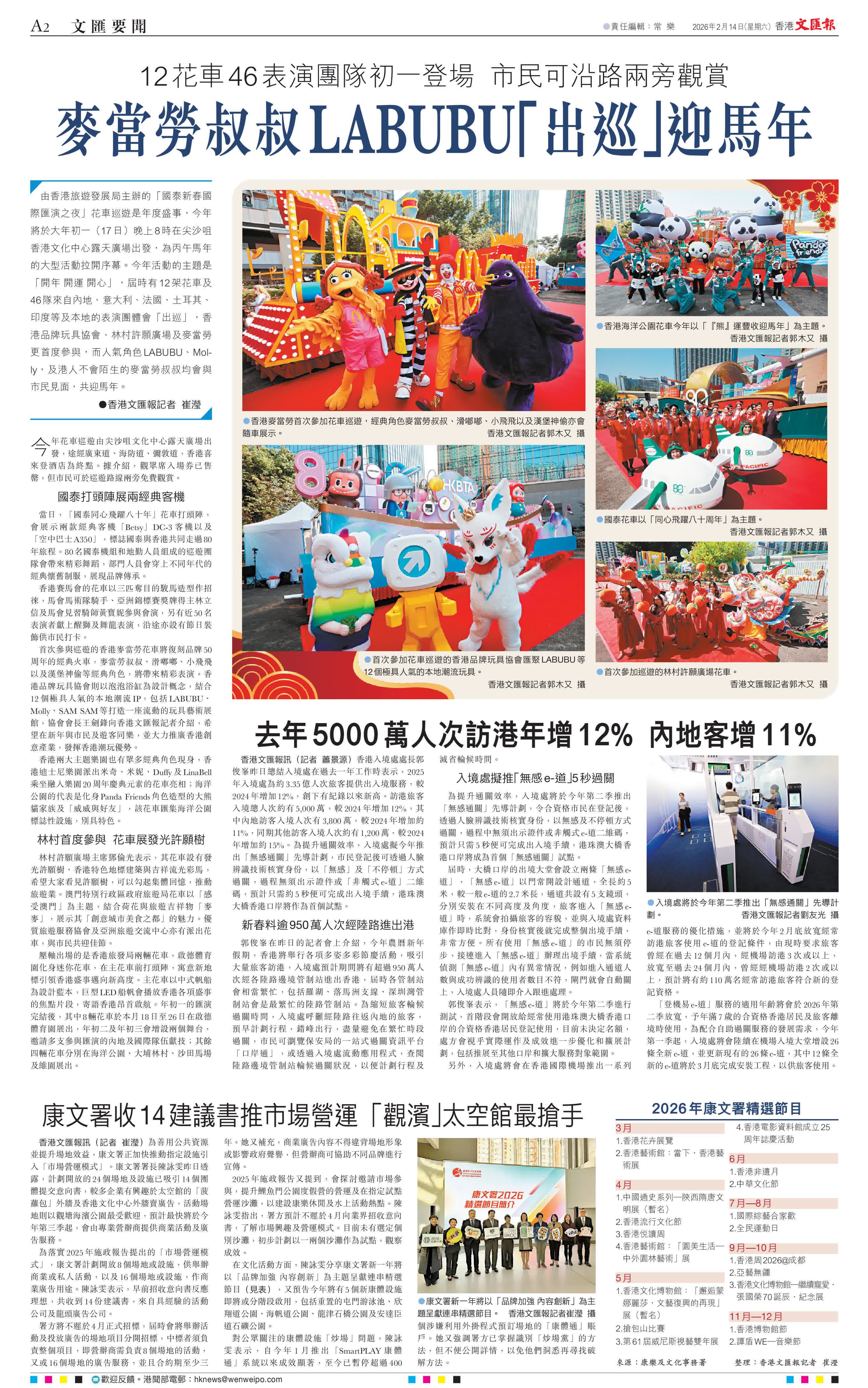 (香港文匯報記者 崔瀅)由香港旅遊發展局主辦的「國泰新春國際匯演之夜」花車巡遊是年度盛事,今年將於大年初一(17日)晚上8時在尖沙咀香港文化中心露天廣場出發,為丙午馬年的大型活動拉開序幕。今年活動的主題是「開年 開運 開心」,屆時有12架花車及46隊來自內地、意大利、法國、土耳其、印度等及本地的表演團體會「出巡」,香港品牌玩具協會、林村許願廣場及麥當勞更首度參與,而人氣角色LABUBU、Molly,及港人不會陌生的麥當勞叔叔均會與市民見面,共迎馬年。