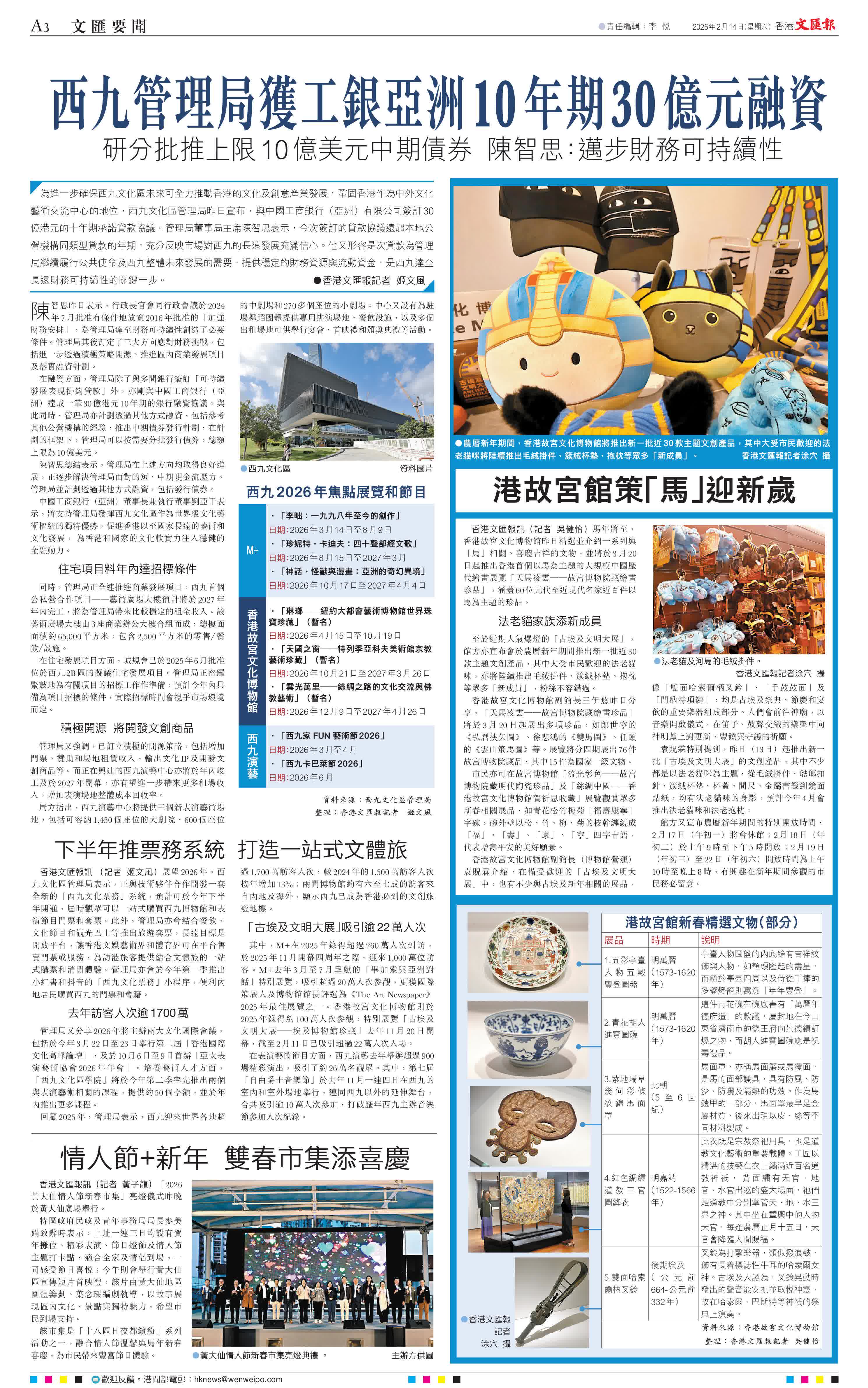 館方又宣布農曆新年期間的特別開放時間,2月17日(年初一)將會休館;2月18日(年初二)於上午9時至下午5時開放;2月19日(年初三)至22日(年初六)開放時間為上午10時至晚上8時,有興趣在新年期間參觀的市民務必留意。