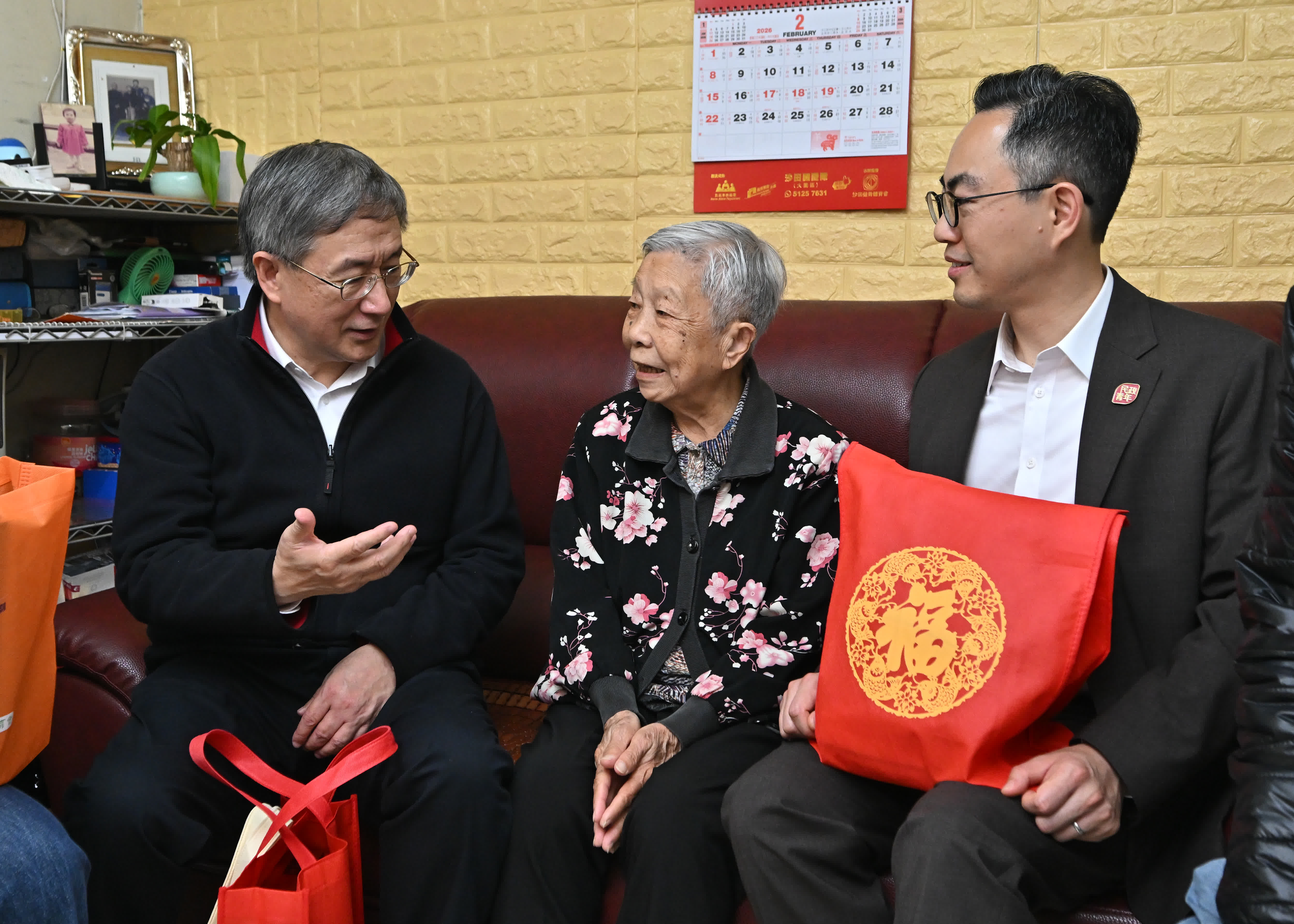 財政司司長陳茂波今日在署理中西區民政事務專員周卓瑩陪同下,聯同中西區區議員和地區服務及關愛隊伍(關愛隊)代表探訪居於堅尼地城的年青家庭和長者家庭,了解他們的生活情況,並送贈賀年福袋,向市民表達問候,祝他們馬年心想事成。
