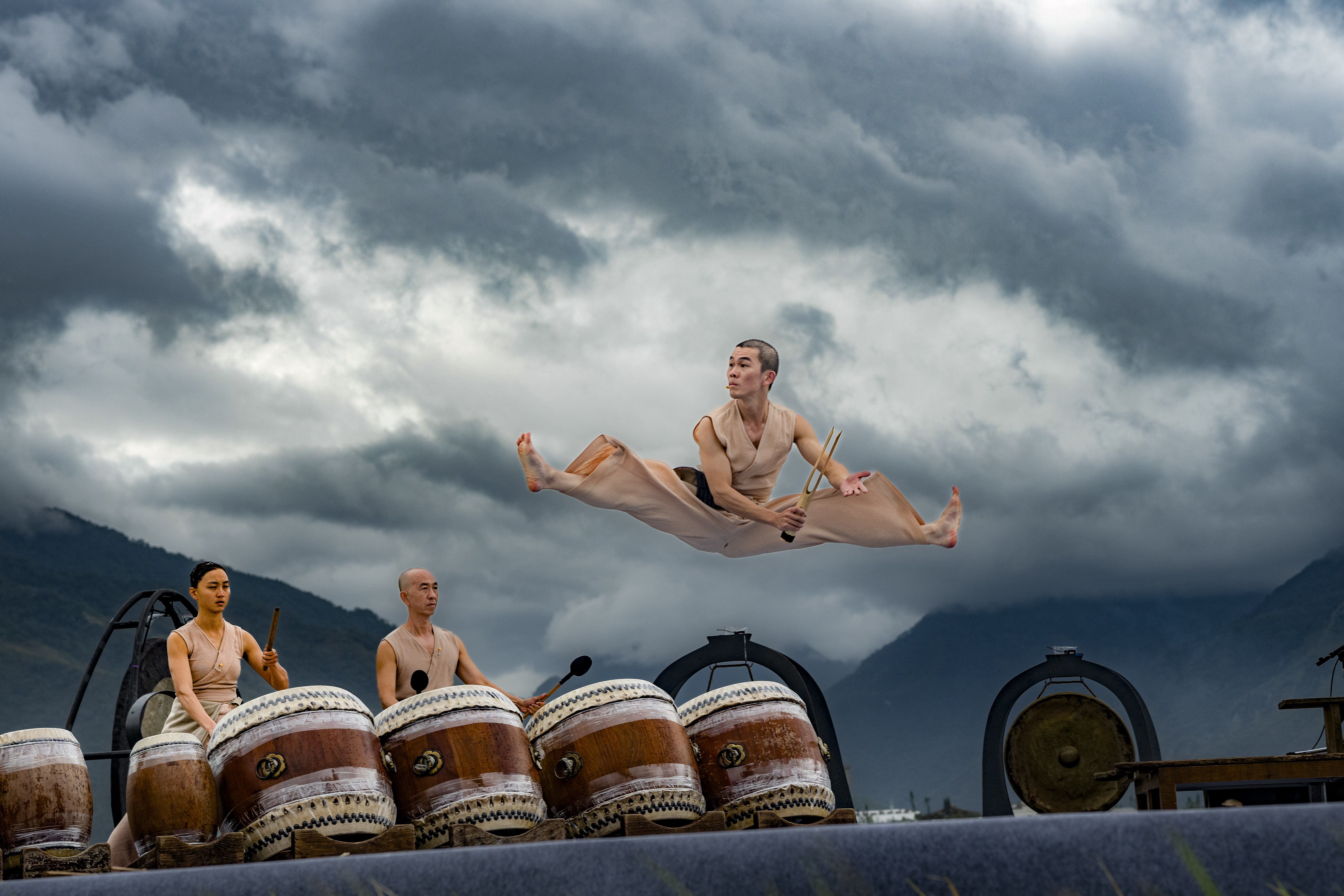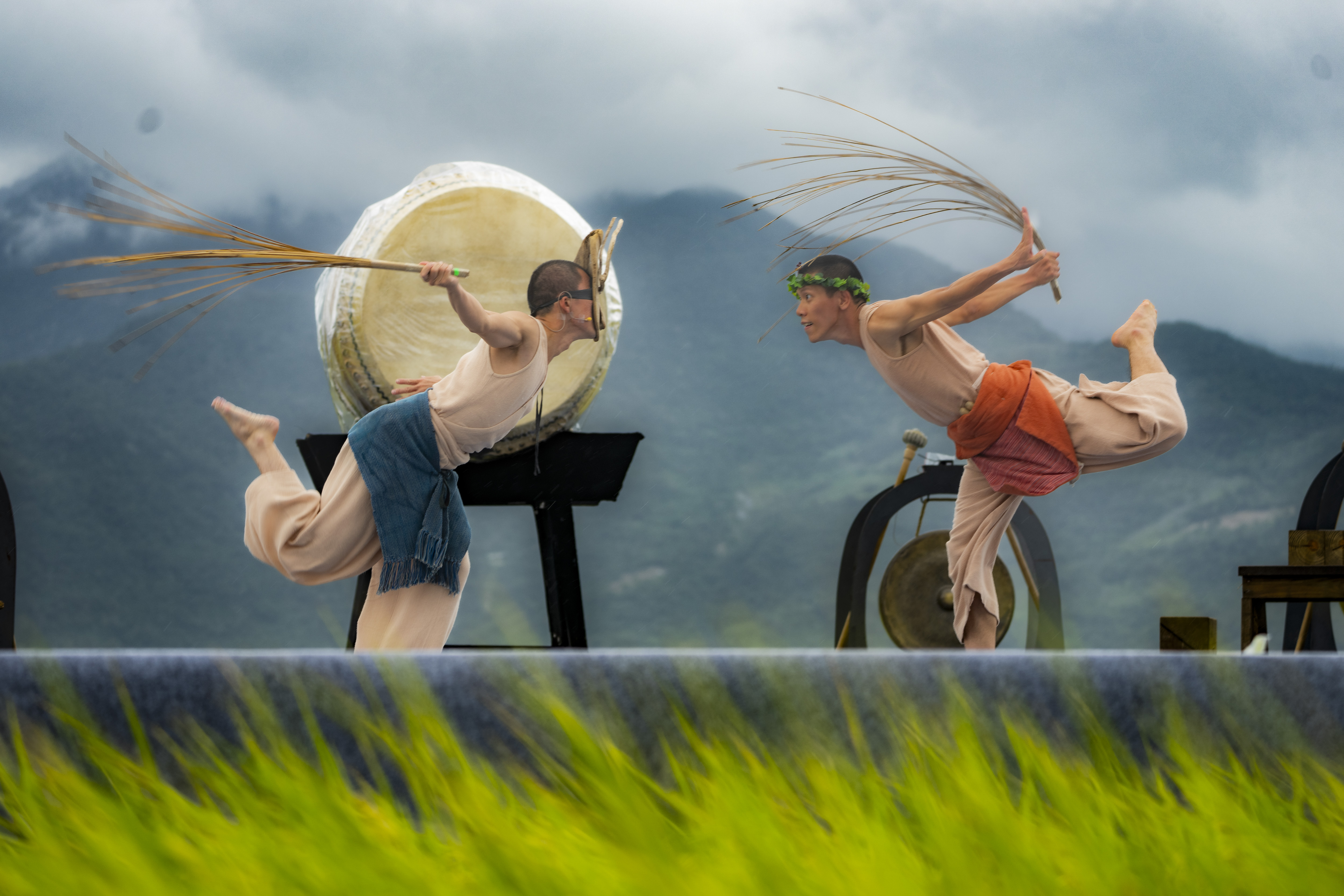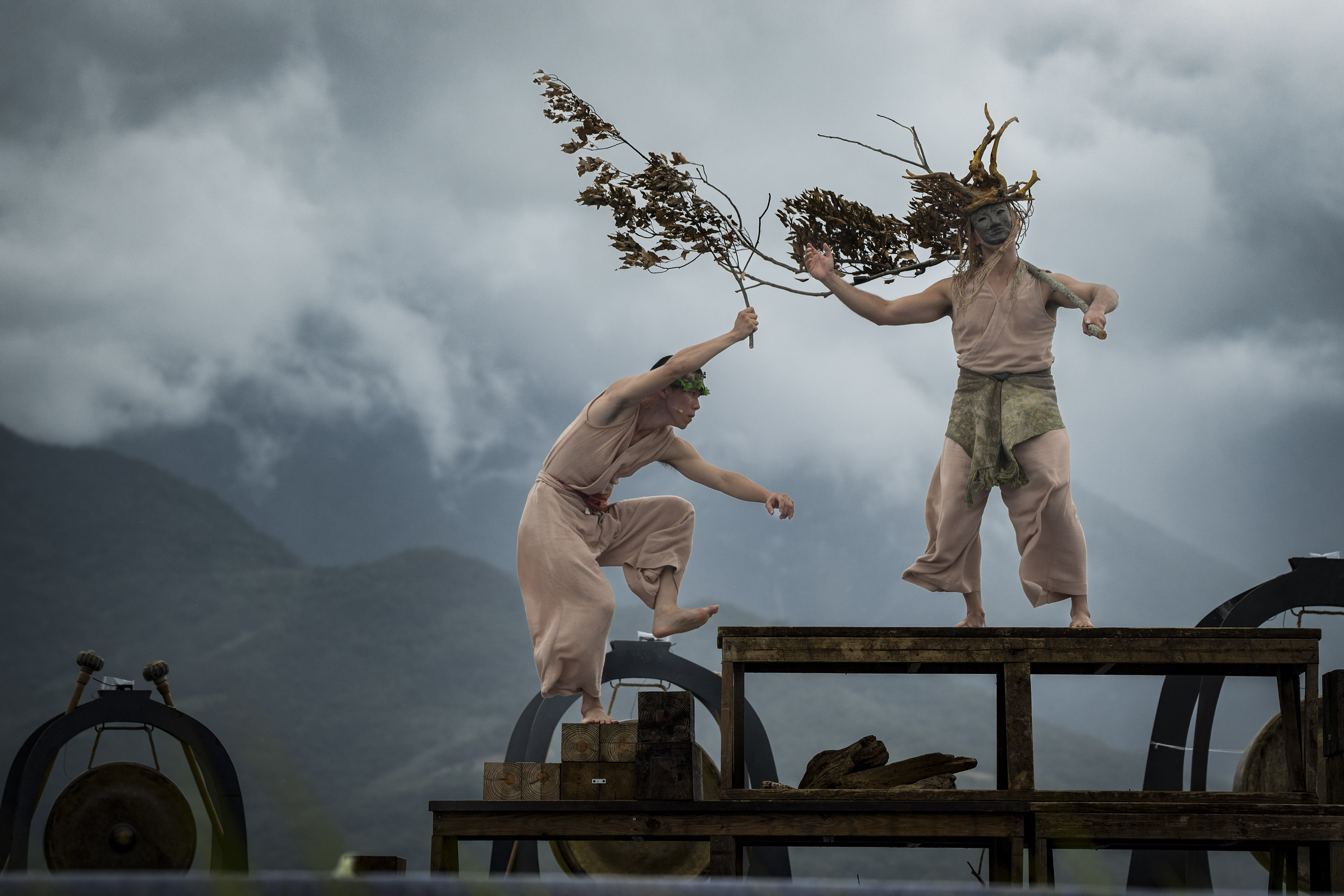 從來便知優人的鼓打得好,這次卻覺得團員的身段動作亦能見出多年在山中與自然為伴所「修煉」出來的質感。鼓樂的震動、團員柔韌身姿的動能,甚至呼吸的吐納,似乎都與天地產生了某種頻率的共振。在獵獵風聲中,吟唱聲、鼓樂聲轟然炸裂又隨風而去,如同魚兒沒入水波;表演者衣腳翻飛,行走、轉圈、翻騰,有武術的氣韻流轉,也有舞蹈的流暢洗練。最難忘是眾人的精神狀態,不急不躁地講一個古樸寓言,如老僧立於山林之中,凝神聚氣間,將這方舞台穩穩紮在天地之中。