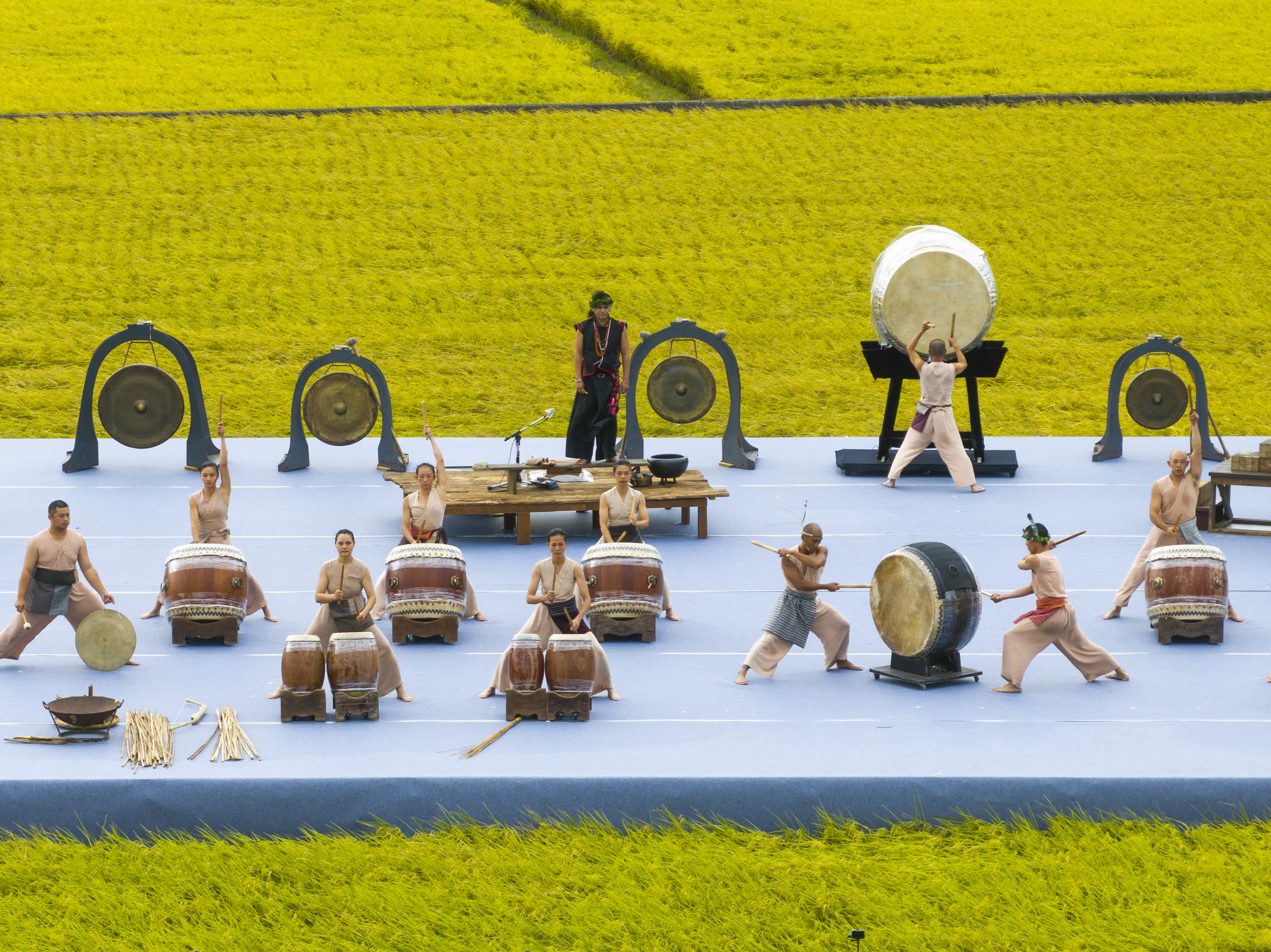 已經走過17個年頭的台東池上秋收稻穗藝術節,以稻浪中的舞台虜獲觀眾的心。每年10月底,鄉民們特意提早割稻,在翻飛的稻浪中拓出一方空地搭建舞台,讓各地湧入的遊人得以體驗何謂「以天地為舞台」。