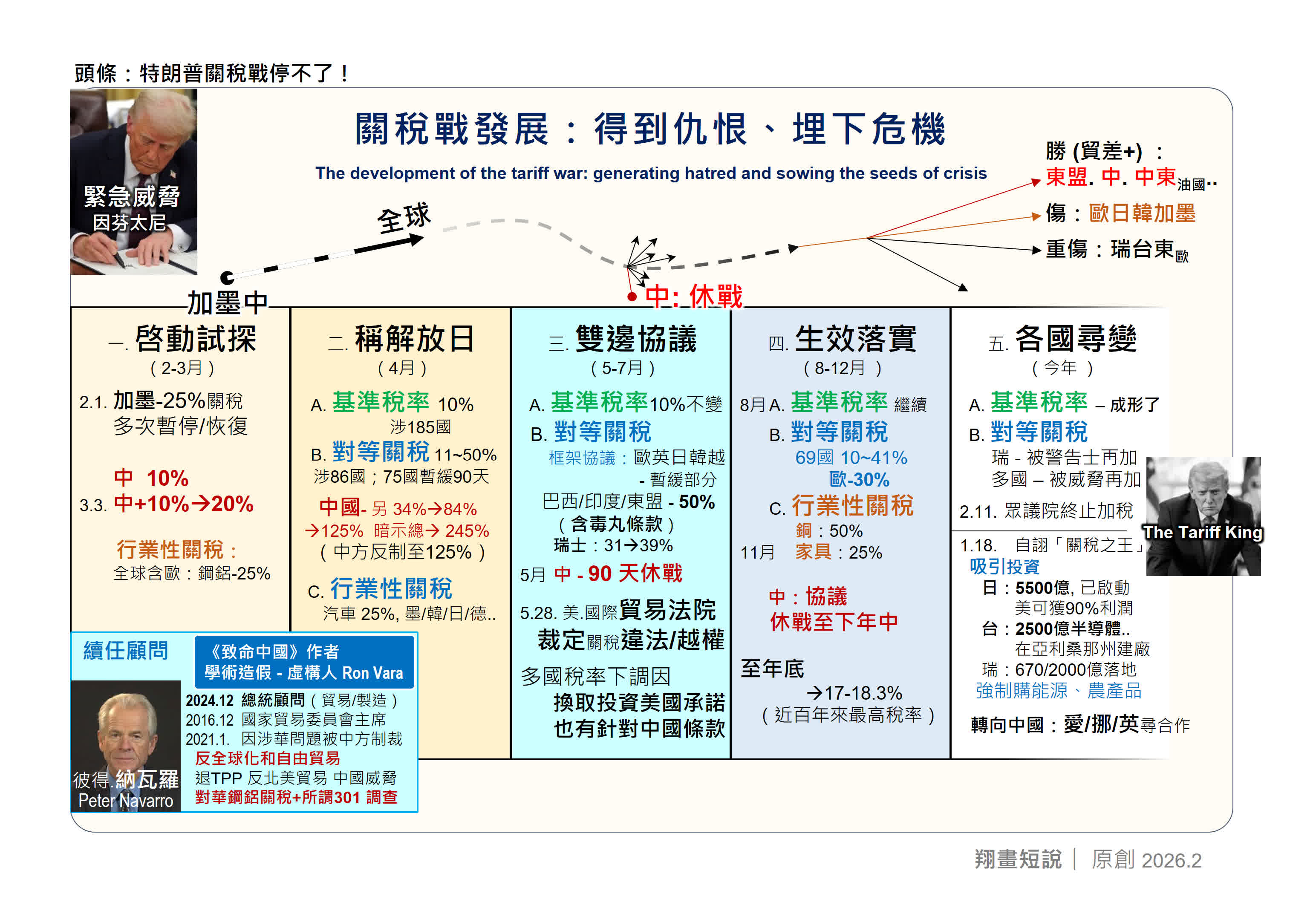 5-7月「雙邊協議」,分別逐一擊破的討價還價階段:「談判」強人特朗普對巴西、印度及東盟徵50%關稅,與歐盟、英國等暫緩部分關稅;瑞士因總統通話語氣惹惱特朗普,關稅從31%提至39%。此階段中美達成90天休戰。美國際貿易法院裁定關稅違法,但政府仍推進政策,多國以投資換取低稅率。