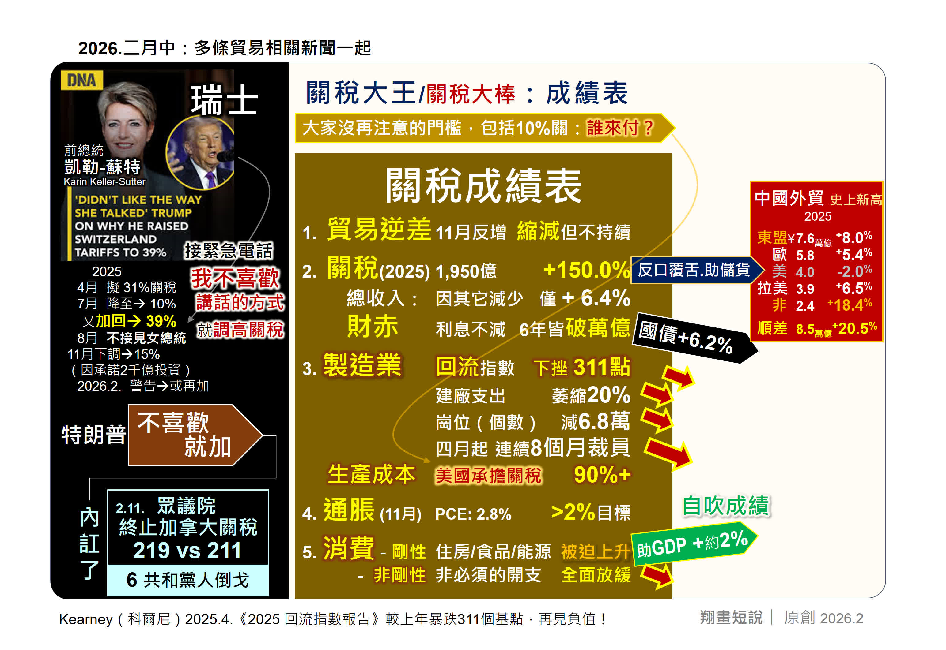 2026年至今「各國尋變」:愛爾蘭、加拿大、英國等轉向與中國合作。特朗普自詡「關稅之王」,羞辱瑞士、追加關稅,逼出瑞士、日本、台灣投資承諾落地。眾議院則通過終止對加關稅案,6名共和黨人倒戈,關稅戰在美國國內並不受歡迎。
