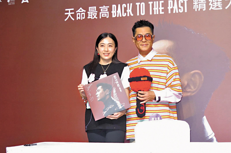 香港文匯報訊(記者 阿祖)古天樂(古仔)首張個人精選專輯《天命最高 BACK TO THE PAST》於昨日情人節推出,新專輯一推出已經斷市要加印,昨日古仔並舉行簽名會為二百位歌迷簽名近距離接觸,商場圍滿五六百人圍觀,相當墟冚。而劉鑾雄太太甘比成為第一位獲親筆簽名的粉絲,她送自己織的大毛冷咪給古仔祝他唱片大賣。
