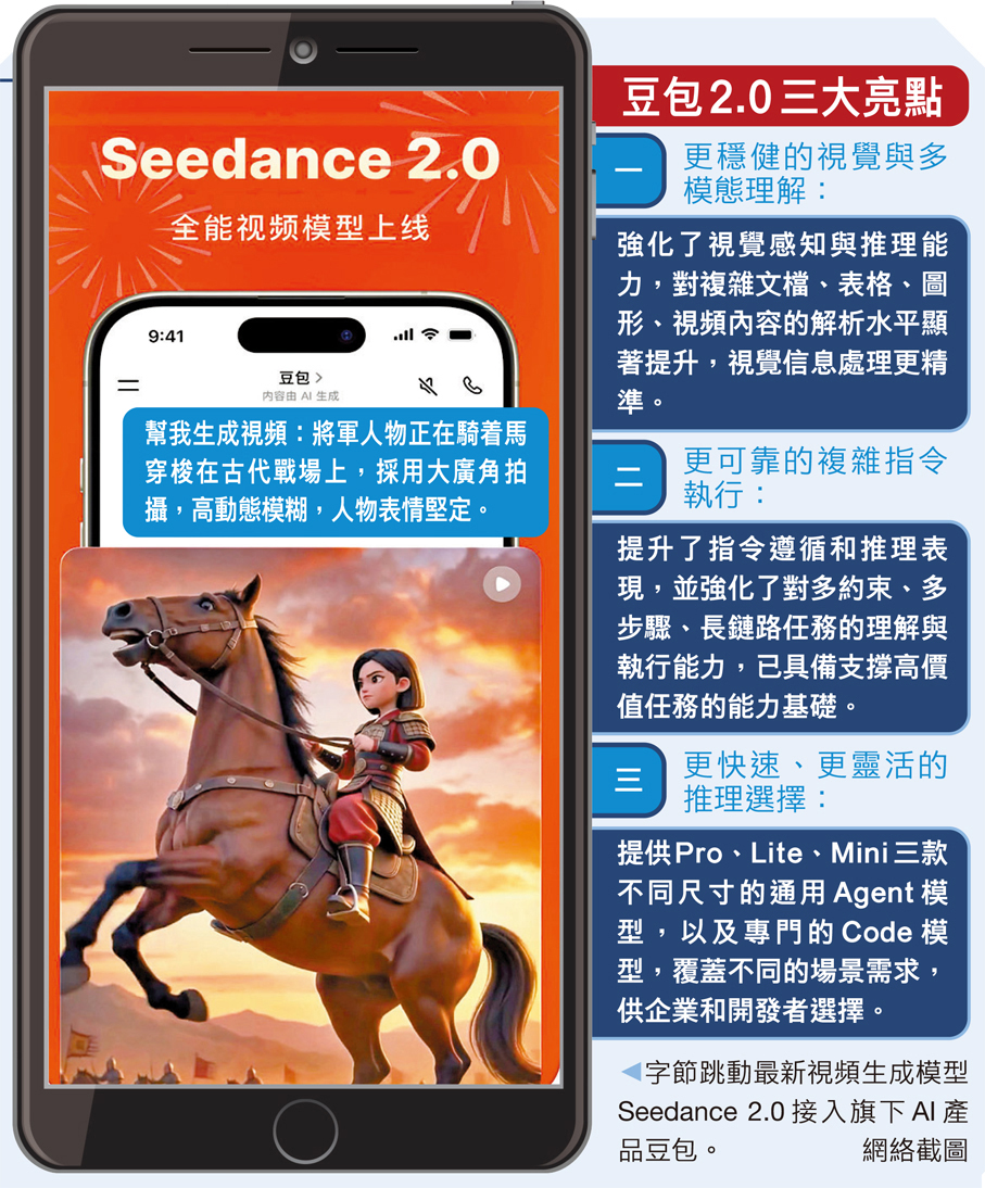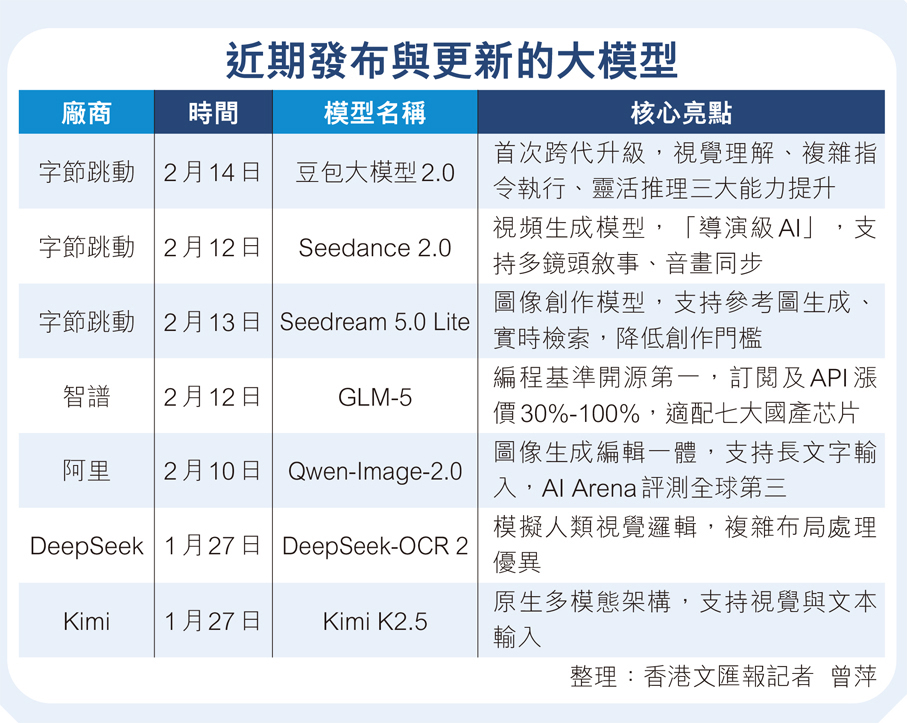 臨近春節,中國AI產業迎來「集體爆發」。從點上看,Seedance 2.0火爆全球,Vidu Q3登頂全球權威榜單,豆包大模型2.0推理能力躍升成行業焦點;從線上看,阿里、DeepSeek、Kimi等在通用對話、編程、多模態、視頻生成各賽道密集「亮劍」;從面上看,這些現象級產品意味着在視頻生成領域,中國AI已穩穩站上全球第一梯隊。短短數年,從ChatGPT、Sora時代的技術旁觀者,到DeepSeek突圍的自主引領,這場由「點」及「線」再成「面」的躍遷,讓中國AI完成了從追趕到並跑的跨越。 ●香港文匯報記者 曾萍 綜合報道