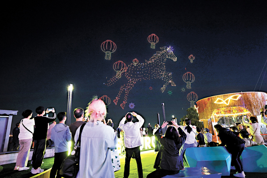 緊接着,無人機再次變陣,於半空中「寫」出「龍馬精神」、「快馬加鞭」、「一馬當先」、「萬馬奔騰」及「馬年大吉」等祝福字句,同時附以不同形態和顏色的駿馬圖案,氣勢磅礴。
