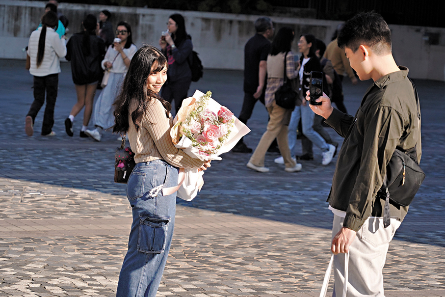 連日來天氣回暖,使今年的情人節更添春意與柔情。香港文匯報記者昨日下午到尖沙咀一帶,發現不少情侶閒逛購物、沿維港漫步。有人環抱大型花束,亦有人「一枝獨秀」將單枝花朵精美包裝;有情人互贈禮物表達心意,或提着精緻購物袋,準備節日驚喜。維港岸邊不乏互相拍照、親暱交談的畫面,甜蜜氣氛瀰漫街頭。星光大道亦有商舖陳設配合節日主題,推出紅色心形氣球、紅心頭箍等裝飾道具,吸引情侶駐足打卡,記錄摯愛時刻。