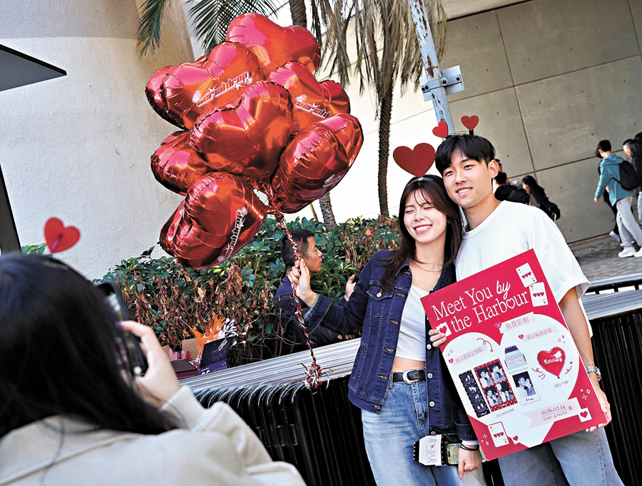 今年情人節適逢年廿七,香港街頭既可見親朋成群歡聚,更不乏情侶結伴過節,一對對情人手捧鮮花、肩挽禮品,走過愛心裝置與各式節日擺設,成為城市間一道浪漫醉人的風景線。香港文匯報記者昨日在尖沙咀海旁直擊,發現原來不少旅客都選擇於香港度過這個浪漫假日,有台灣情侶早已預訂情人節套餐以饗味蕾,也有內地旅人攜伴探索城市一隅,記錄屬於二人的甜蜜戀曲。無論形式如何,天下有情人紛紛以自己的方式表達愛意,為節日添上暖心一筆。●文︰香港文匯報記者 李千尋