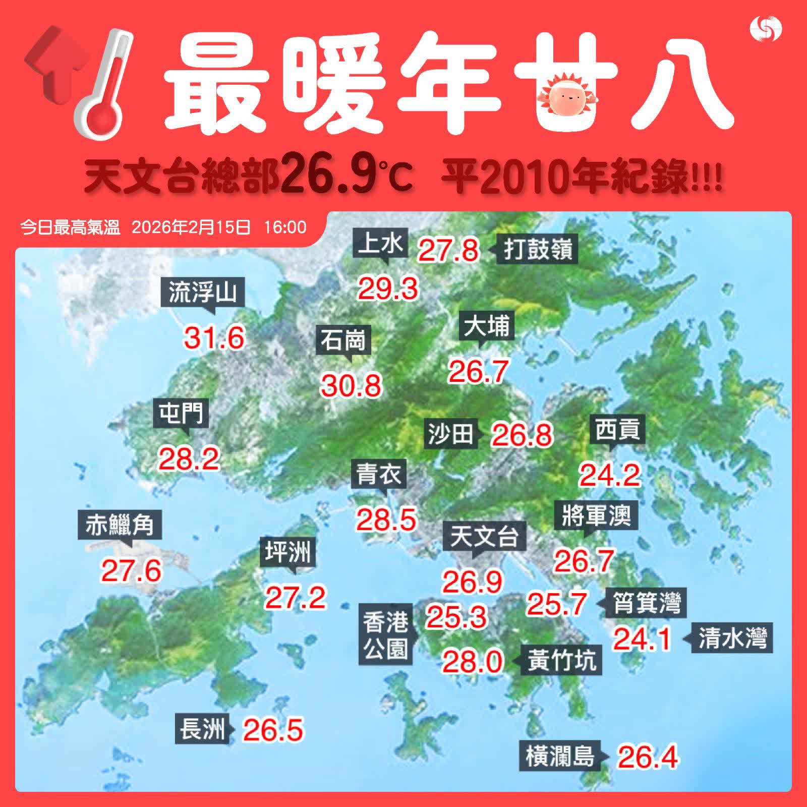 香港文匯報訊(記者 蕭景源)今日(15日)年廿八下午4時,天文台總部錄得最高氣溫26.9度,平了有紀錄以來2010年年廿八最高溫紀錄;黃竹坑、青衣及屯門則錄得28度或以上氣溫,而上水、石崗和流浮山更分別錄得29.3度、30.8度及31.6度高溫。由於日間天氣和暖,部分市民出街都換上短袖衫。