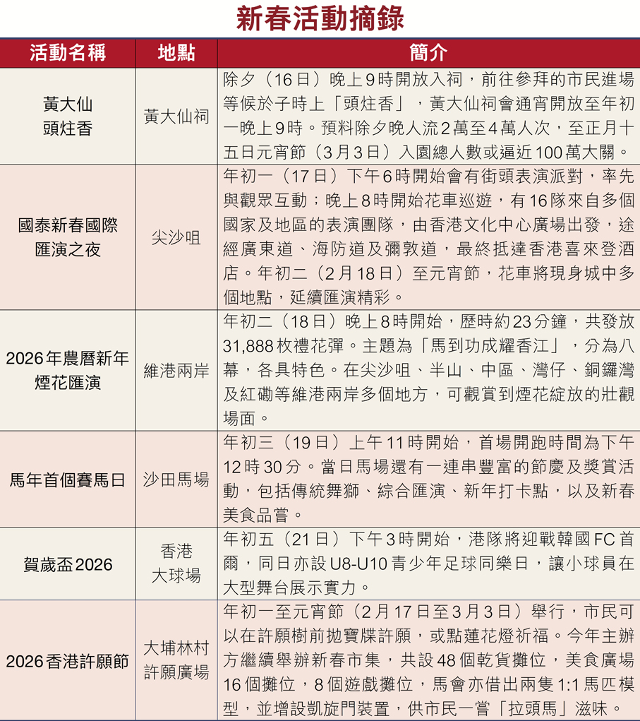 年初二的維港煙花匯演則以「馬到功成耀香江」為主題,合共將發放31,888枚禮花彈,並配有燈光效果,提供更精彩的觀賞體驗。年初三的賀歲賽馬、年初五的足球賀歲盃,以至各區香火鼎盛的傳統廟宇,都讓香港在農曆新年期間盛事連連、區區熱鬧。