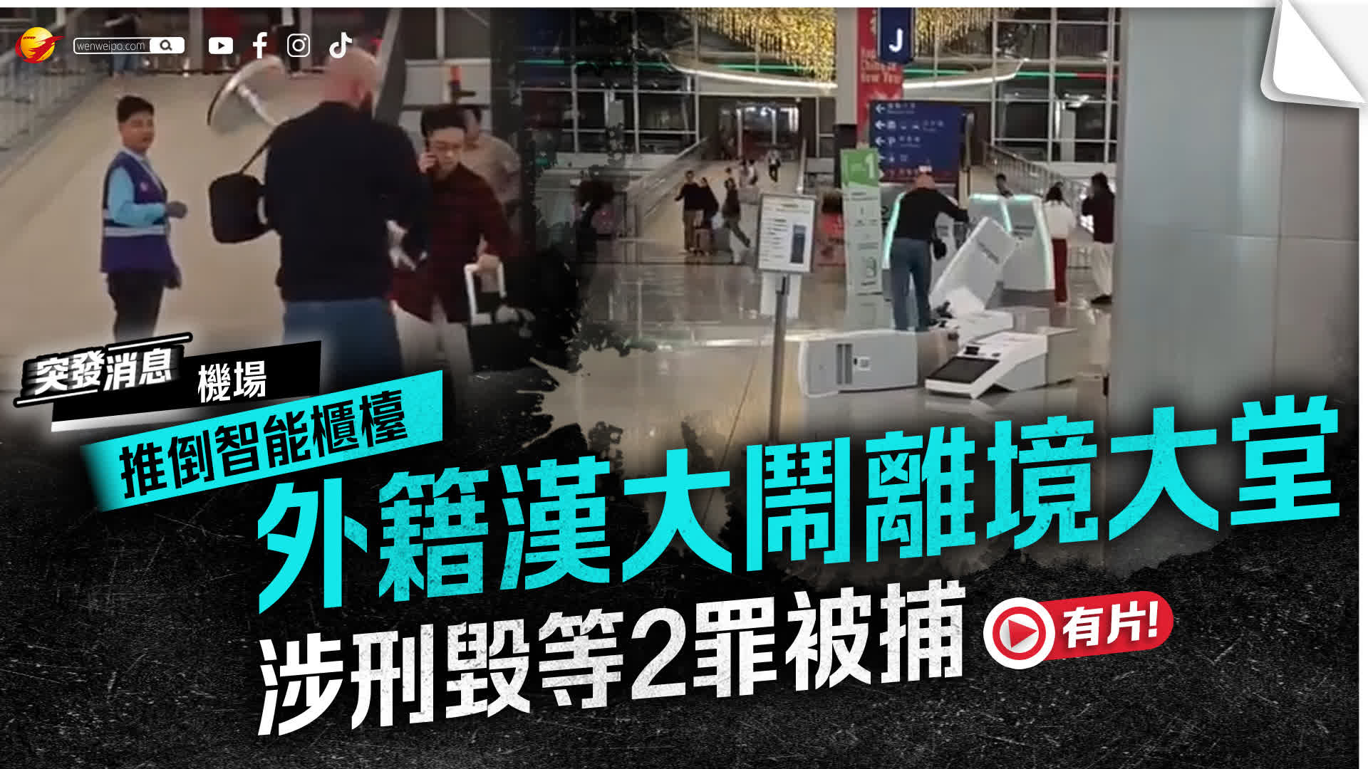香港文匯報訊(記者 蕭景源)今日(16日)清晨近6時,一名35歲英國籍男子,推着載有自身行李的手推車,抵達香港國際機場1號客運大樓北離境大堂旅客登記J行段。期間,英籍男突然情緒激動,先後用行李手推車撞跌上址的鐵欄,繼而用手推倒10部智能登記櫃檯,並毀壞櫃檯一塊玻璃後離去。航空公司職員及機管局職員見狀,隨即報案求助。