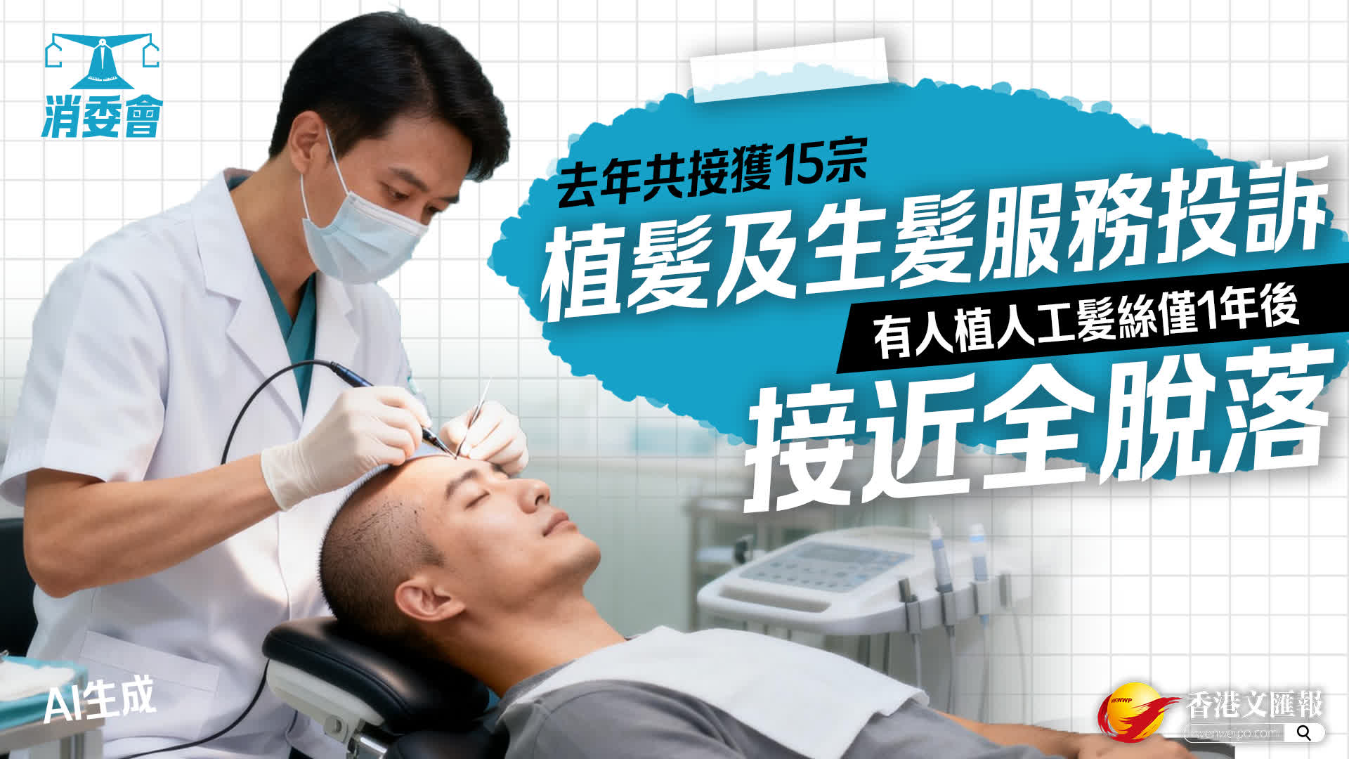 消委會去年至今年1月,共接獲15宗與植髮及生髮服務有關的投訴,當中涉及質疑生髮療程誇大效果宣傳、頭皮發炎及人工髮絲脫落等問題。