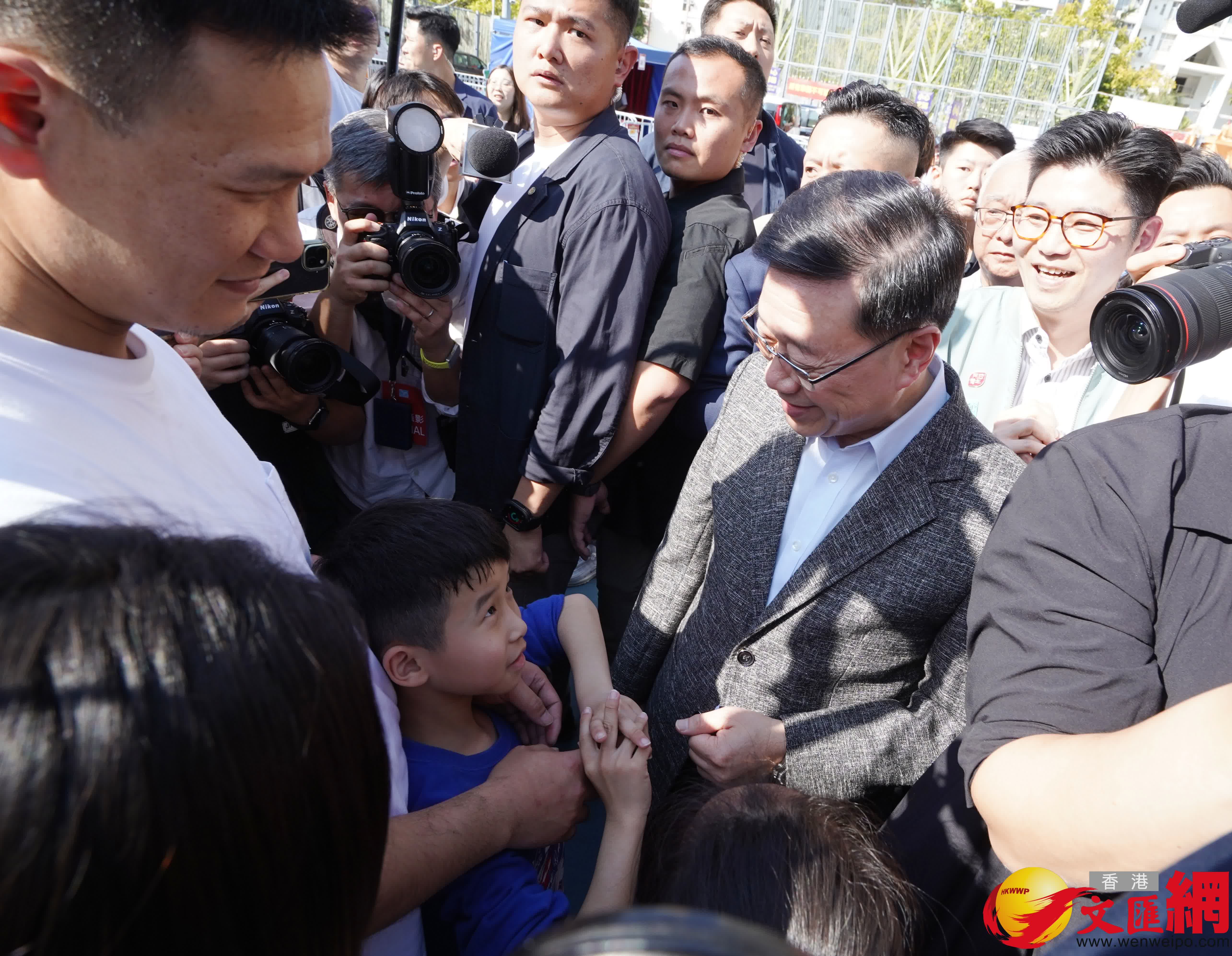 今天(16日)是農曆年廿九除夕,行政長官李家超和民政及青年事務局長麥美娟、環境及生態局局長謝展寰等,下午到訪觀塘遊樂場新年年宵市場。李家超沿途向市民送上新年祝福,並和小朋友交談,他祝福香港市民「龍馬精神、一馬當先、馬到功成、馬上有福。」