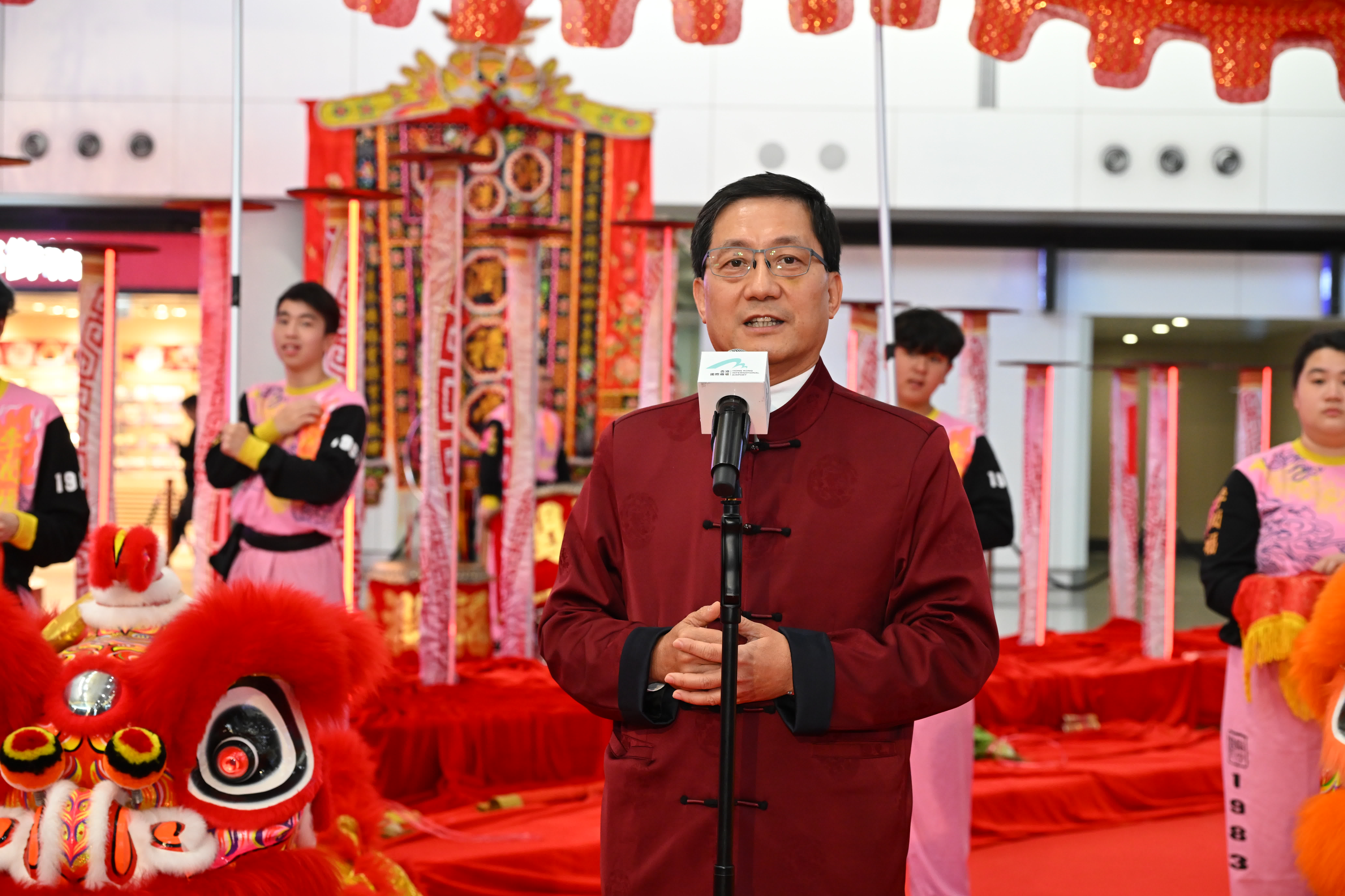 林天福致辭時表示,二號客運大樓設計活潑、年輕化和具科技感,將帶來不同新科技,並有不同自助服務設計,亦會帶來更多餐飲選擇。大樓的離港設施5月投入運作,有助應付預計在暑假旅遊旺季出現的客運高峰,為旅客帶來舒適便捷的新體驗。他又指,今年農曆新年假期長,有不少旅客來港感受新春氣氛,機場高峰至上周已出現,本港出入境數字多日均超過20萬人次,預計趨勢會延至下周。