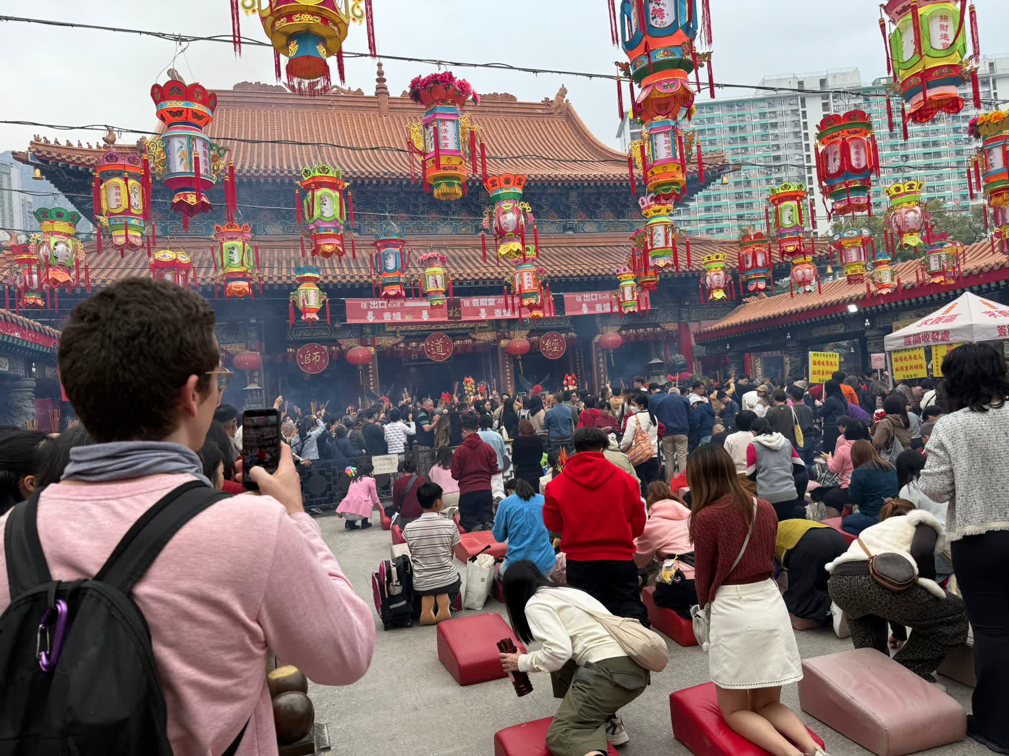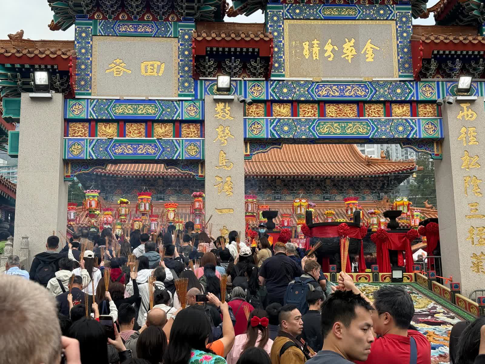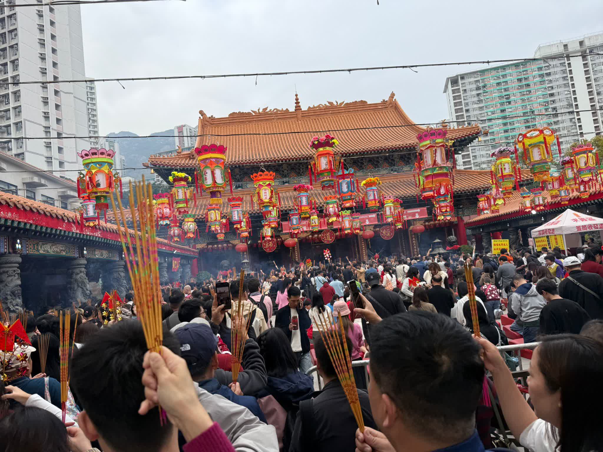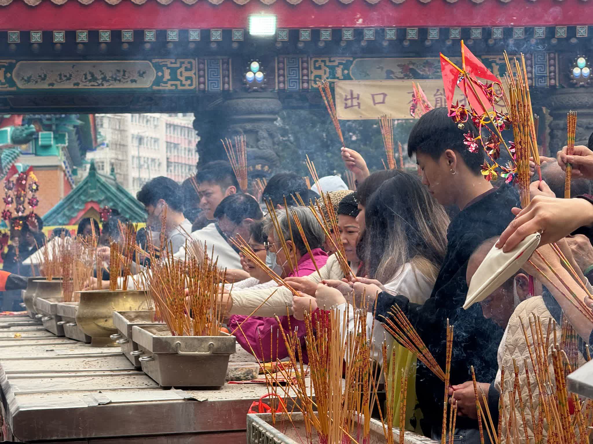 大年初一,不少市民到黃大仙祠上香祈福,誠心祈求新一年事事順利,心想事成。祠內香火鼎盛,祠外有賣香燭和風車的檔主表示,今年人流多,帶動生意不錯。黃大仙祠預計至正月十五元宵節,會有近100萬人參拜。(圖:香港文匯報記者蕭景源)