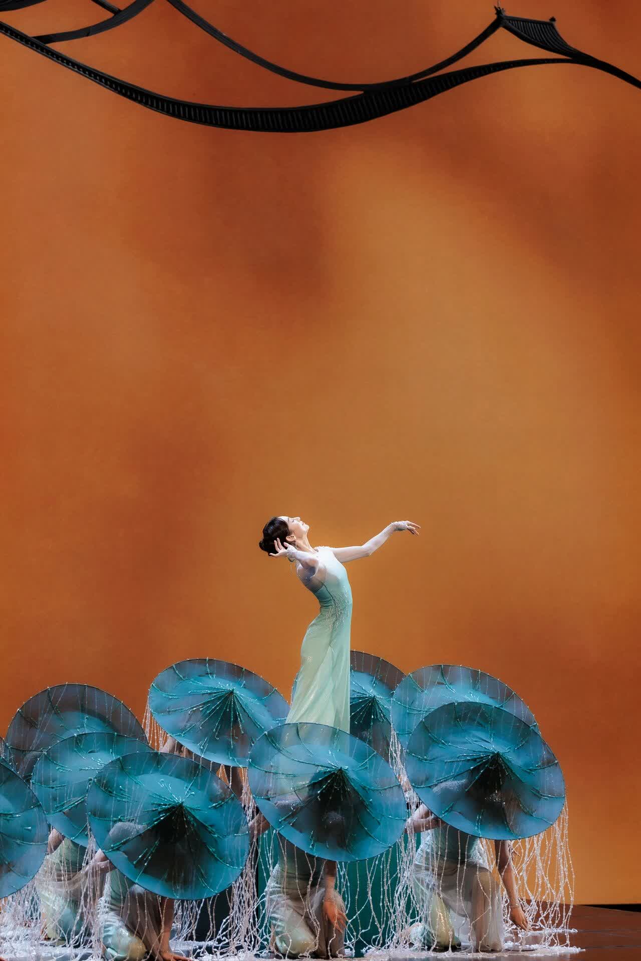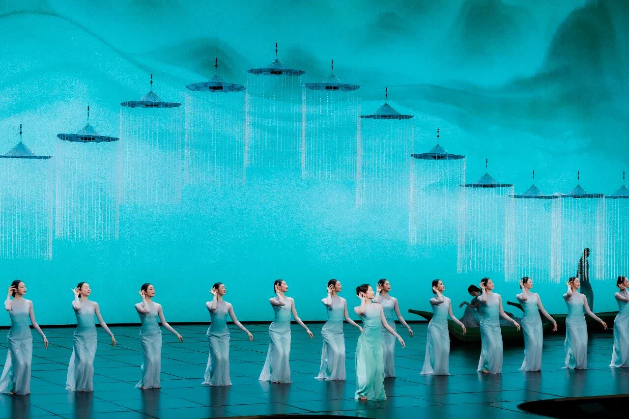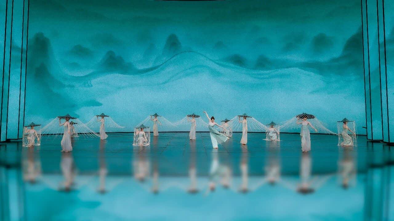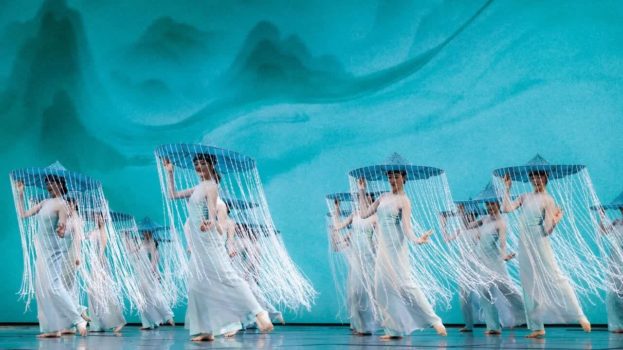 為了將這份詩意搬上舞台,舞蹈選用了一隻看似簡單卻耗時幾個月打磨出的道具——綴滿珠簾的斗笠。斗笠是江南煙雨中常見的物件,導演組在斗笠邊沿垂下一圈珠簾,營造出「雨滴凝固」的效果。舞者傾斜身體,珠簾便如斜風細雨般傾瀉;舞者旋轉起舞,珠簾如瓢潑大雨般飛揚;舞者上下跳躍,珠簾落地便有了蘇軾詩中「白雨跳珠亂入船」的妙感。