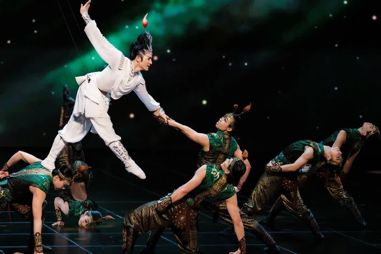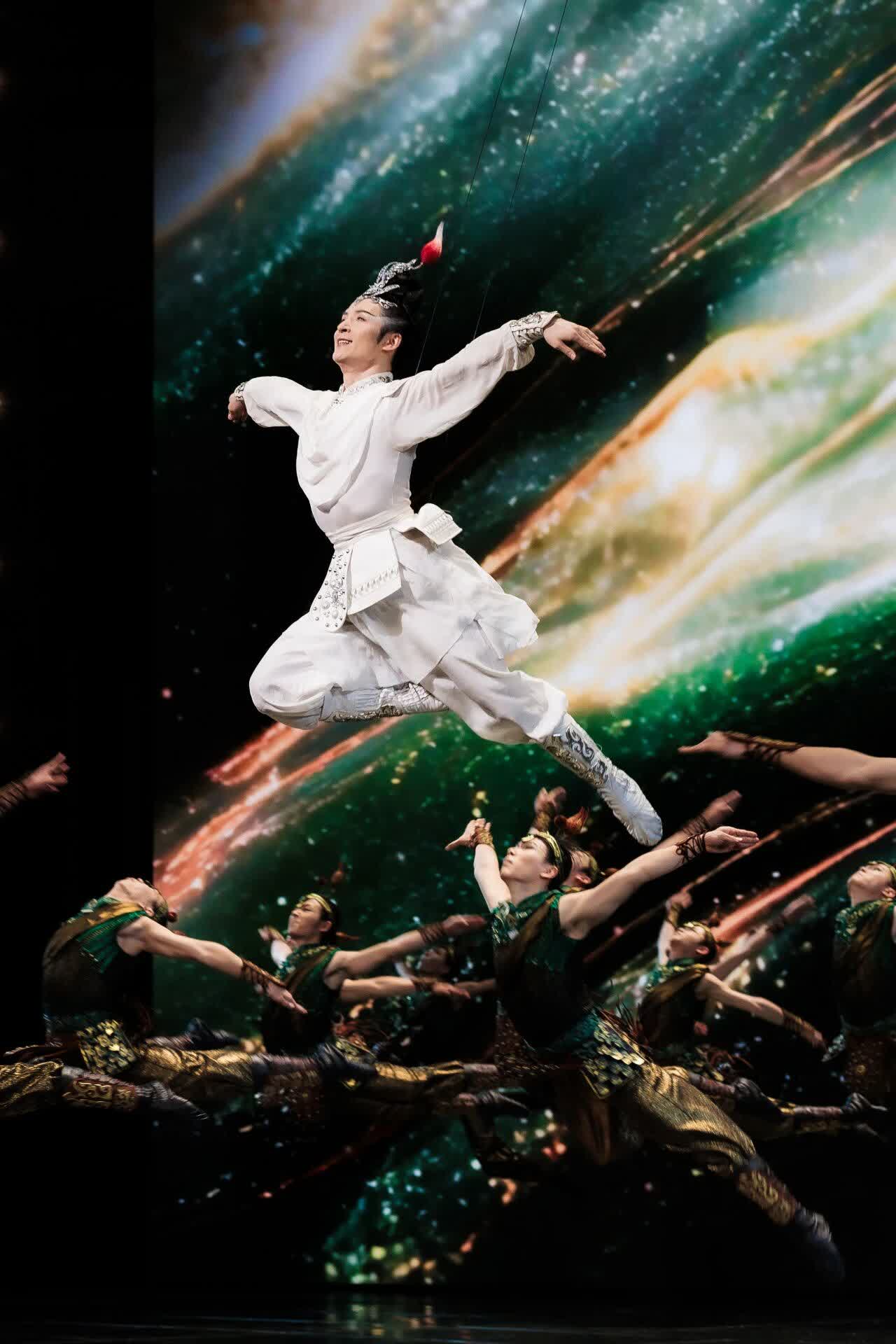 而真正讓這份「精神」得以騰空、形成視覺衝擊力的,是威亞技術與舞蹈語言的深度融合。導演組啟用了威亞系統,不同於龍年《錦鯉》使用的數控威亞,演員蹬地彈跳展現少女的輕盈躍動,《追影》要體現男子的力量感,完成大量的承托、推送、翻騰等複雜動作,必須改用力量控制感更好的人力威亞。