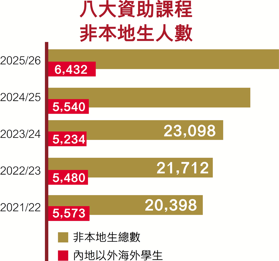 香港致力吸納全球優秀學生,非本地學生上限接連放寬到四至五成,本學年八所資助大學非本地生人數突破3萬;其中內地以外的海外學生亦達6,432名,創出歷史新高,突顯香港的國際化教育特色。